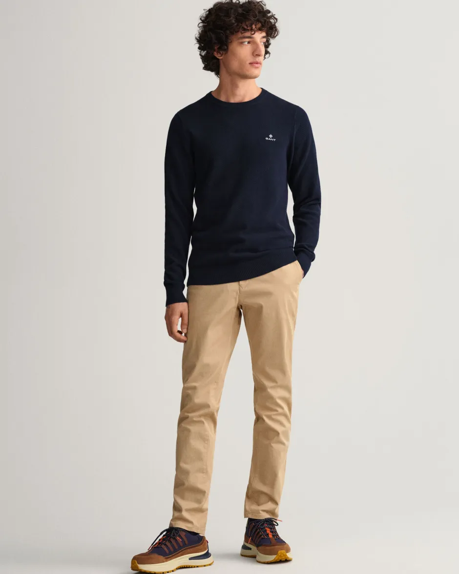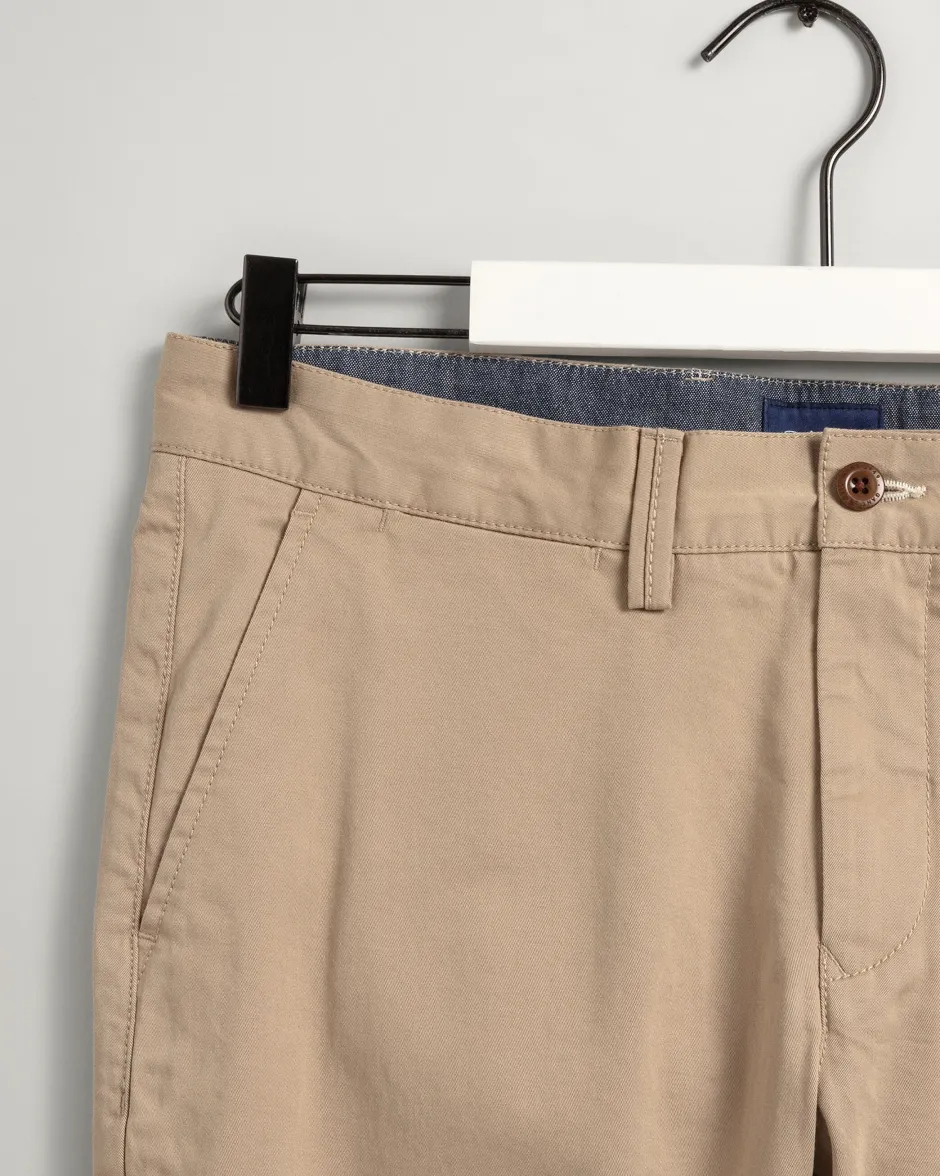 Kapea mitoitus Normaali vyötärö ja kapeat lahkeet Mukavan joustavat Takana olevan teretaskun yläpuolella kudottu GANT-merkki Malli on 189 cm pitkä ja käyttää kokoa 32/32