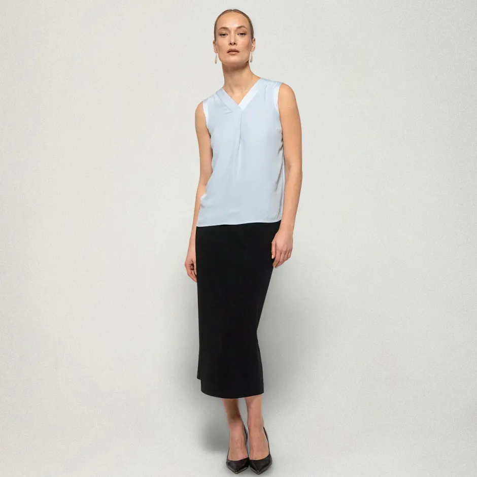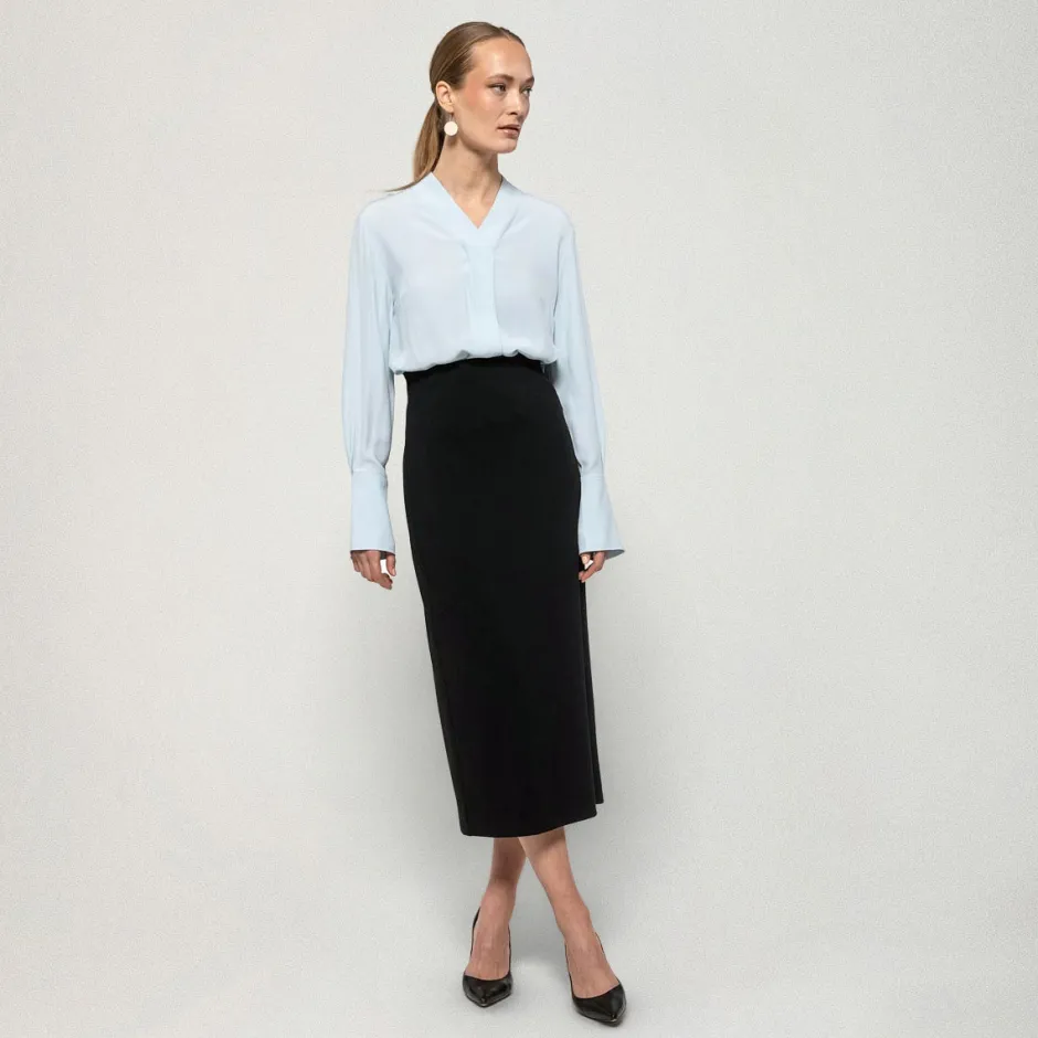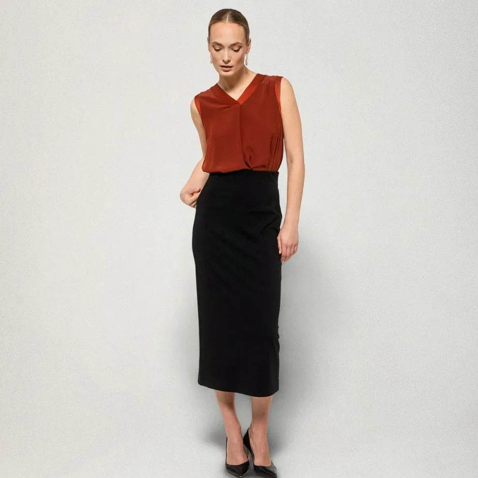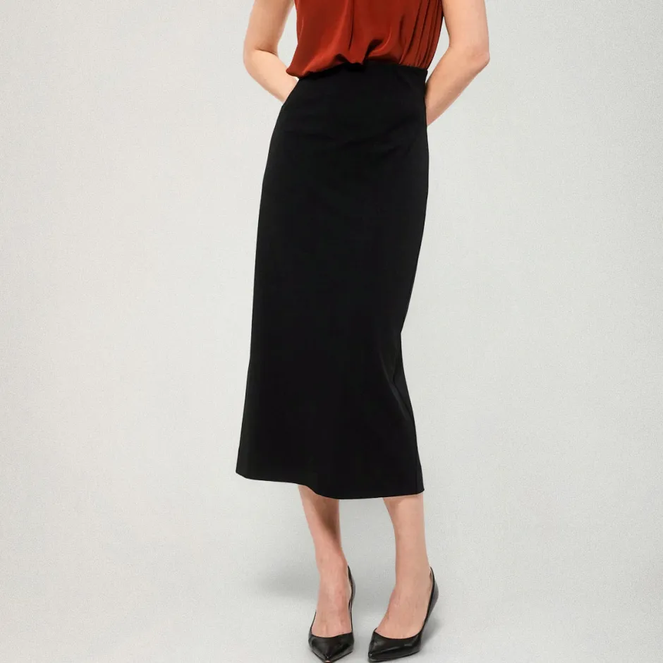 Kapeassa, vartalonmyötäisessä Fiia-hameessa on korkea vyötärö. Hameen materiaali on joustavaa, napakkaa, jersey-neulosta. Suunniteltu Suomessa.