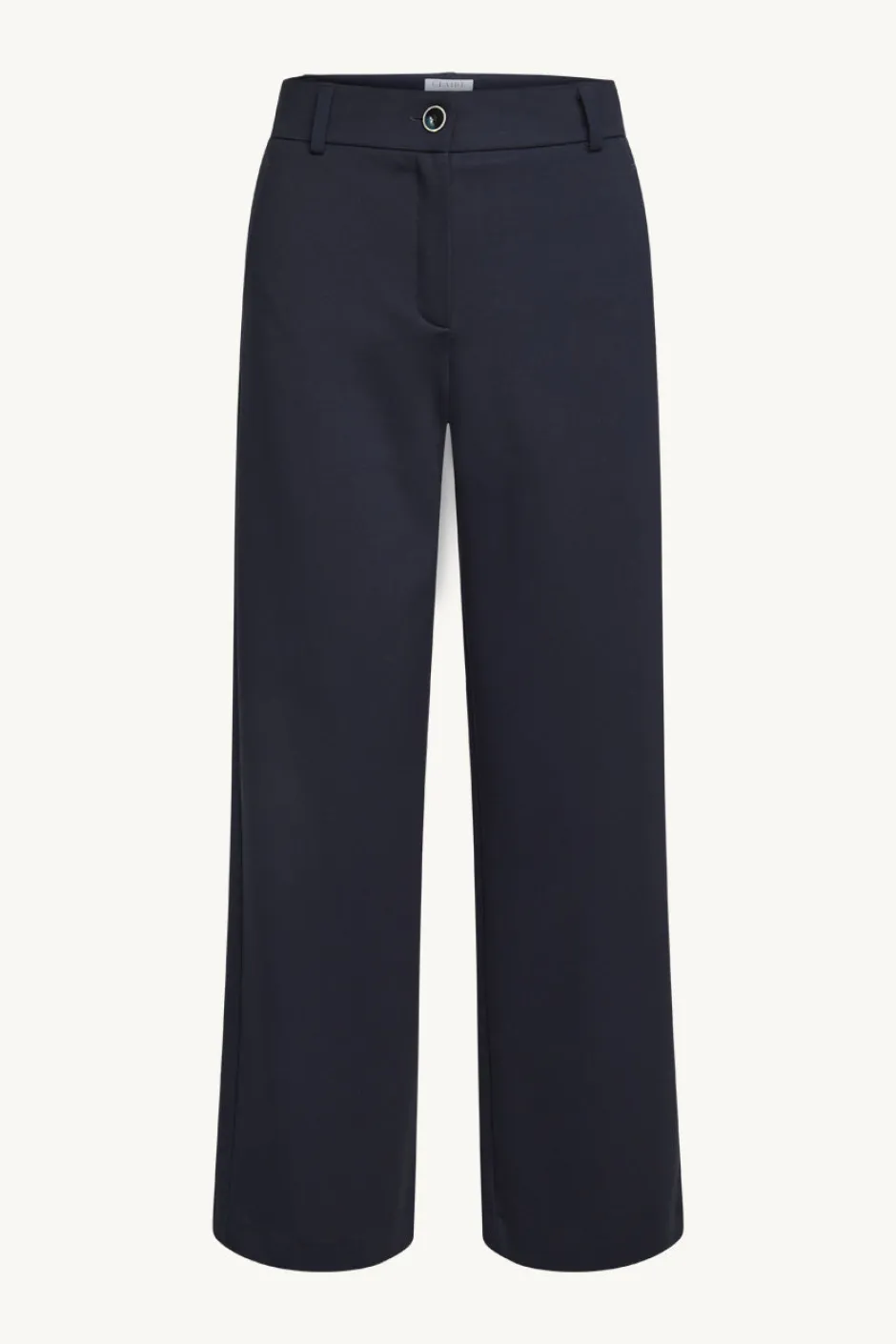 Klassiset housut, joissa leveät lahkeet ja vinot etutaskut. Housuissa on vyölenkit ja tekotasku takana.