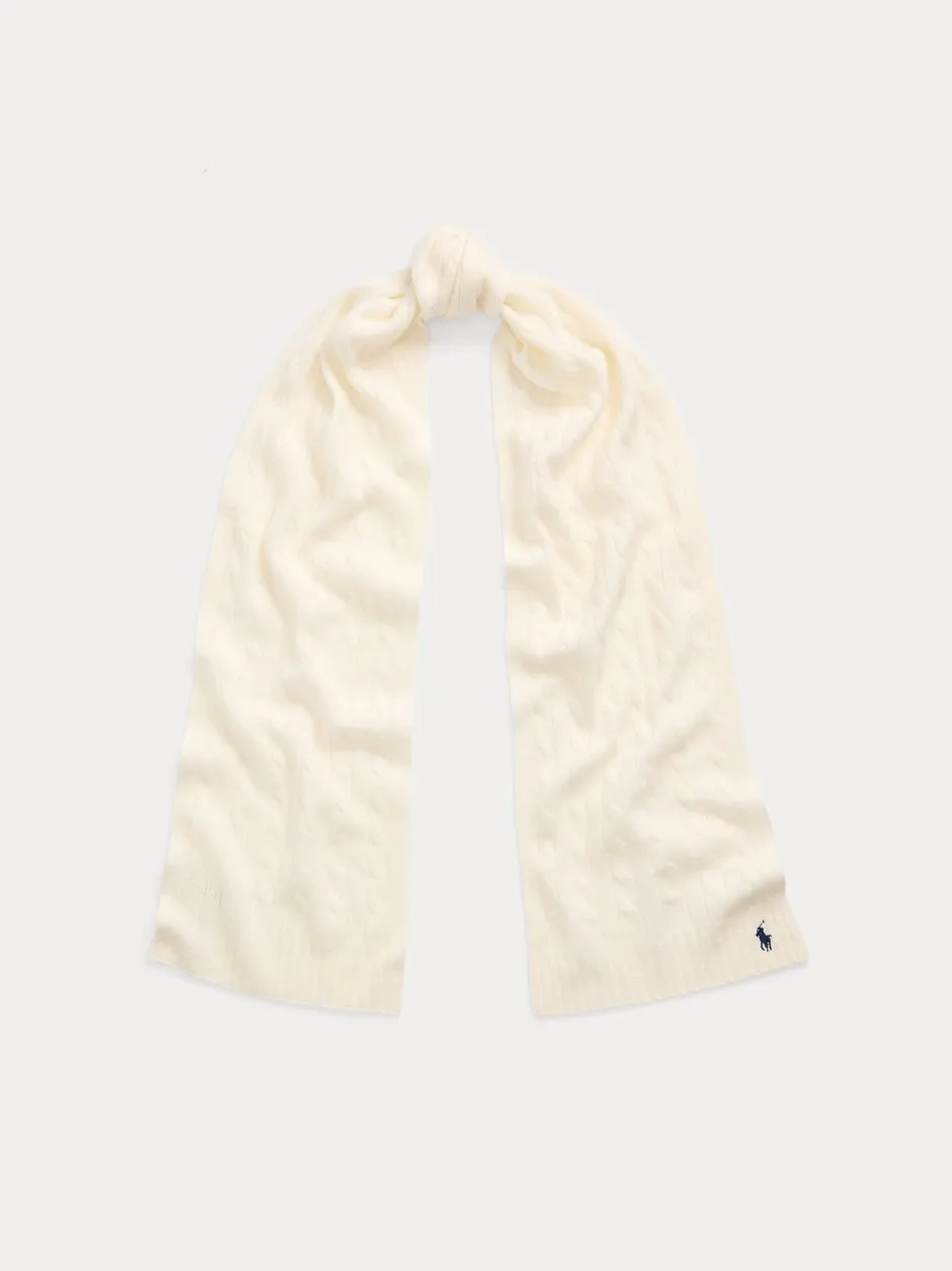 Ylellisestä villan ja kashmirlangan sekoituksesta valmistetussa huivissa on Ralph Laurenille tyypillinen palmikkoneulos, ja sitä korostaa kirjailtu poni-kuviomme.