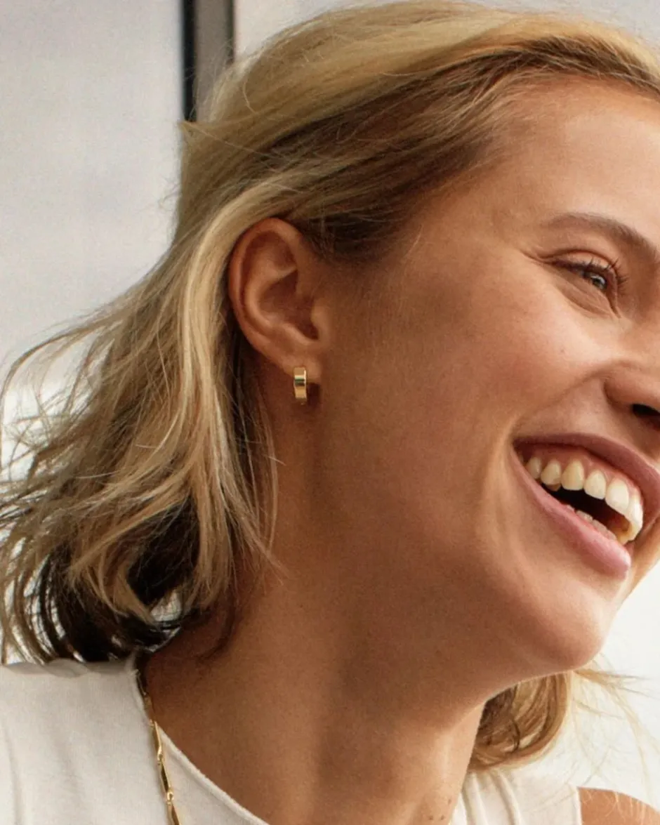 Edbladin Fave Hoops Gold -korvakorut ovat pienikokoiset ja elegantit renkaat, joiden halkaisija on 12 mm ja leveys 3,5 mm. Ne on valmistettu ruostumattomasta teräksestä ja viimeistelty 14 k kultauksella. Korvakorut ovat nikkeliturvalliset ja vedenkestävät.