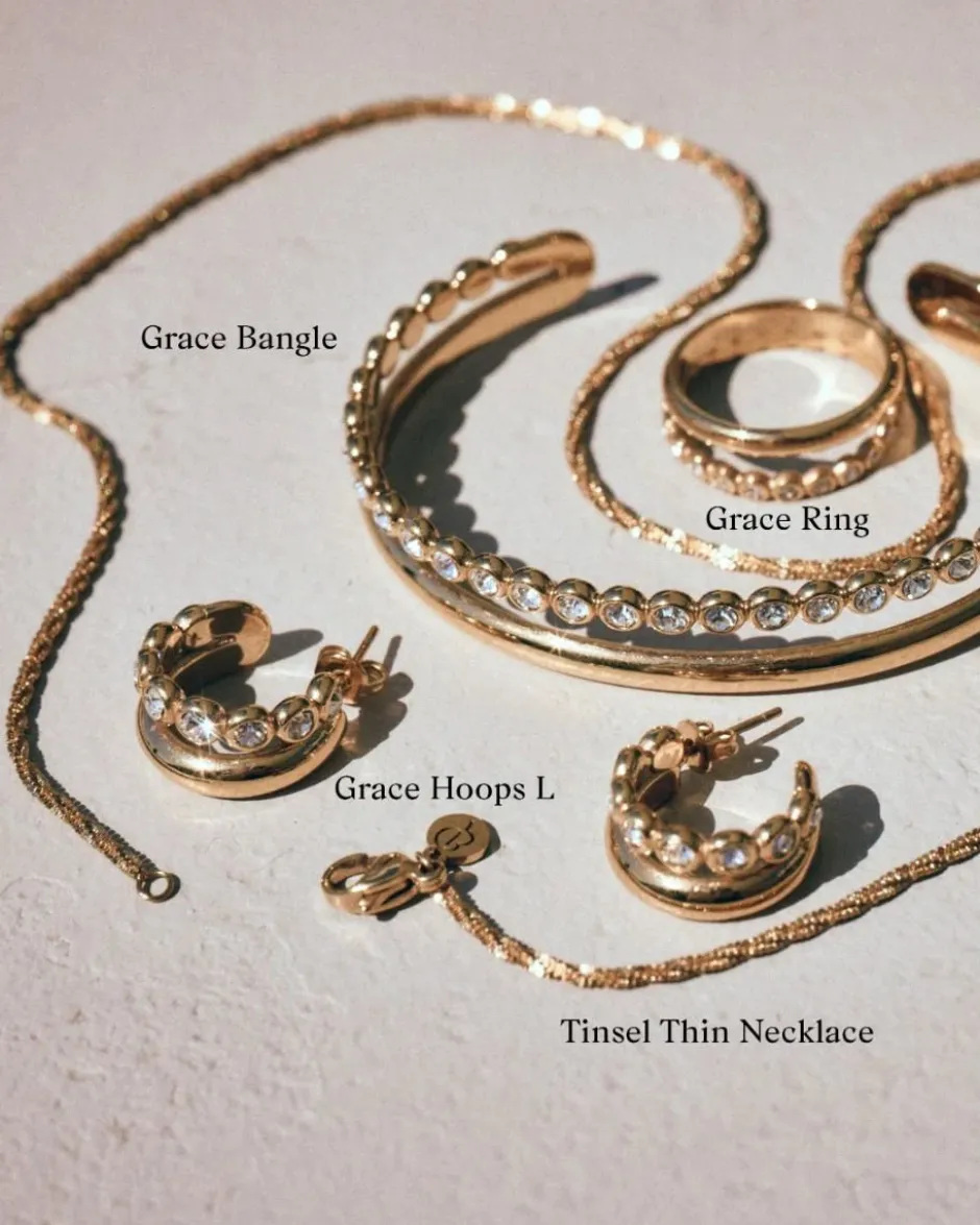Grace-sarjan korut ovat klassisia modernilla otteella. Erittäin tyylikäs ja helppokäyttöinen sarja, jossa yksinkertaisuus yhdistyy glamouriin ja joka sopii juhlaviin tilaisuuksiin, kun haluat hieman lisäkimallusta. Tässä hieman suuremmat korvarenkaat 14 karaatin kultauksella ja kahdella rungolla, joista yhdessä on kimaltavia kiviä ja toisessa ei. Ne näyttävät siltä kuin korvissa olisi kahdet korvakorut. Sopivat hyvin yhdistettäväksi sarjan rannerenkaan tai sormuksen kanssa.