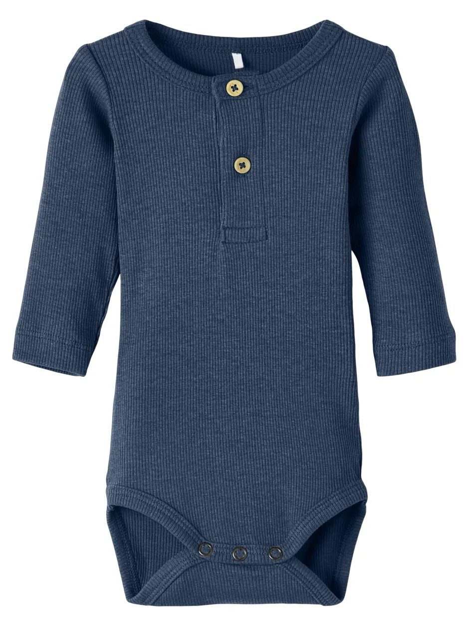Lasten pitkähihainen body ribbineulosta. Kiinnitys neppareilla haarasta ja edessä pääntiellä nappihalkio.