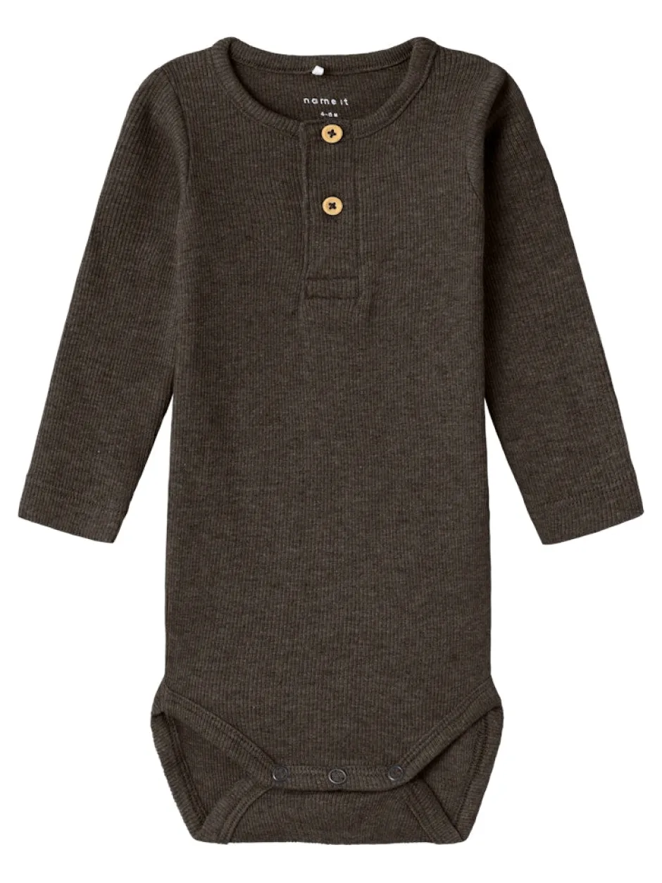 Lasten pitkähihainen body ribbineulosta. Kiinnitys neppareilla haarasta ja edessä pääntiellä nappihalkio.
