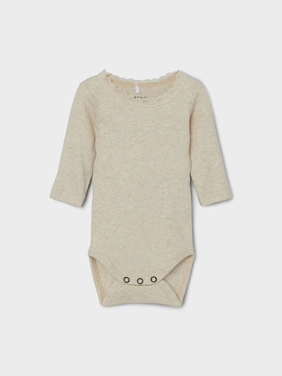 Name It lasten pitkähihaine ribbineulos body. Kiinnitys painonapeilla. Kauluksessa koristepitsiä. Tuotteen valmistuksessa on käytetty luomupuuvillaa.