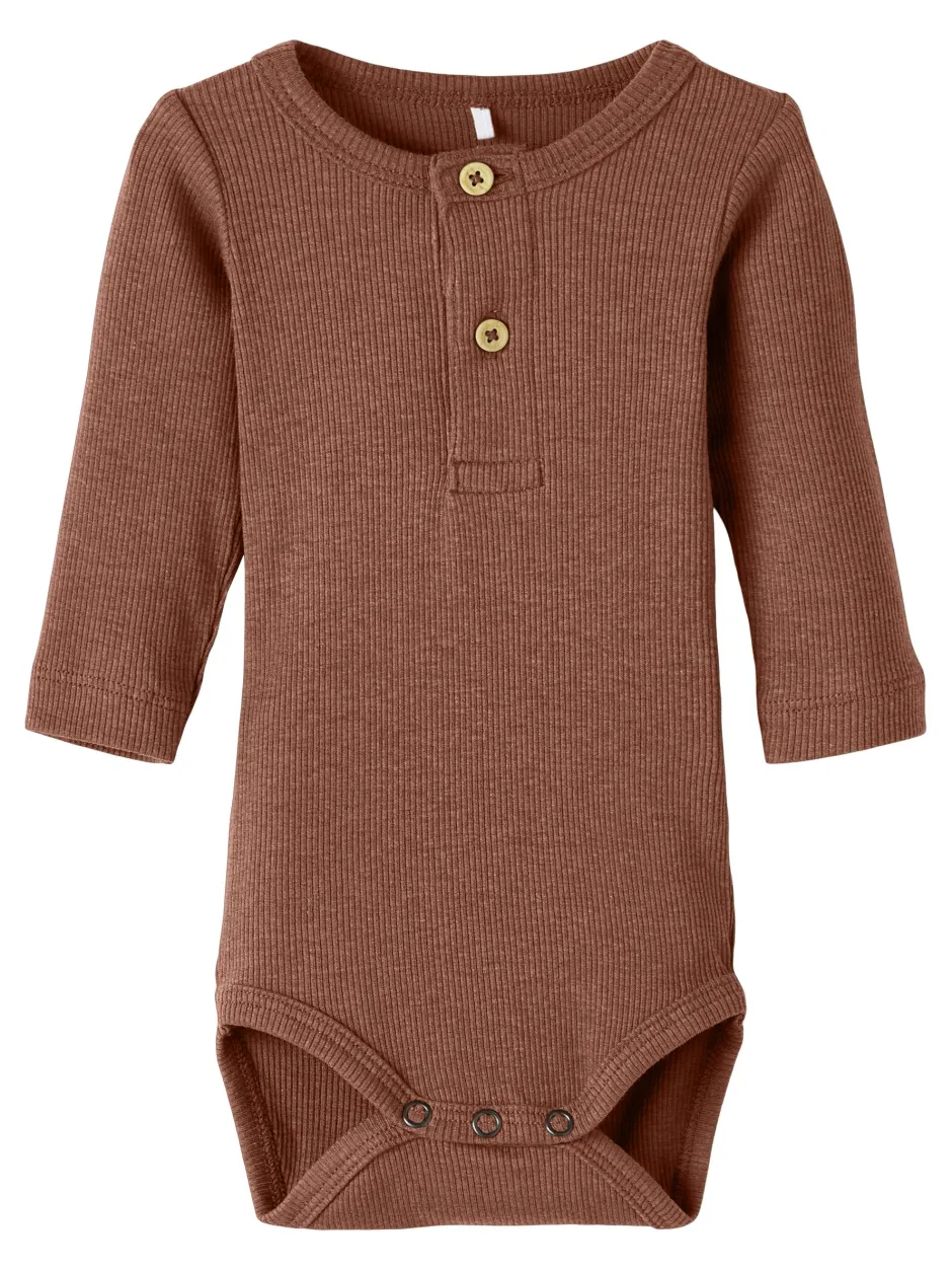 Lasten pitkähihainen body ribbineulosta. Kiinnitys neppareilla haarasta ja edessä pääntiellä nappihalkio.