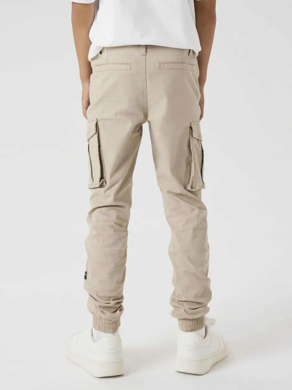 Name it rennot twillhousut. Reisitaskuissa neppariläpät ja lahkeissa kuminauhat. Takana koristetaskut.