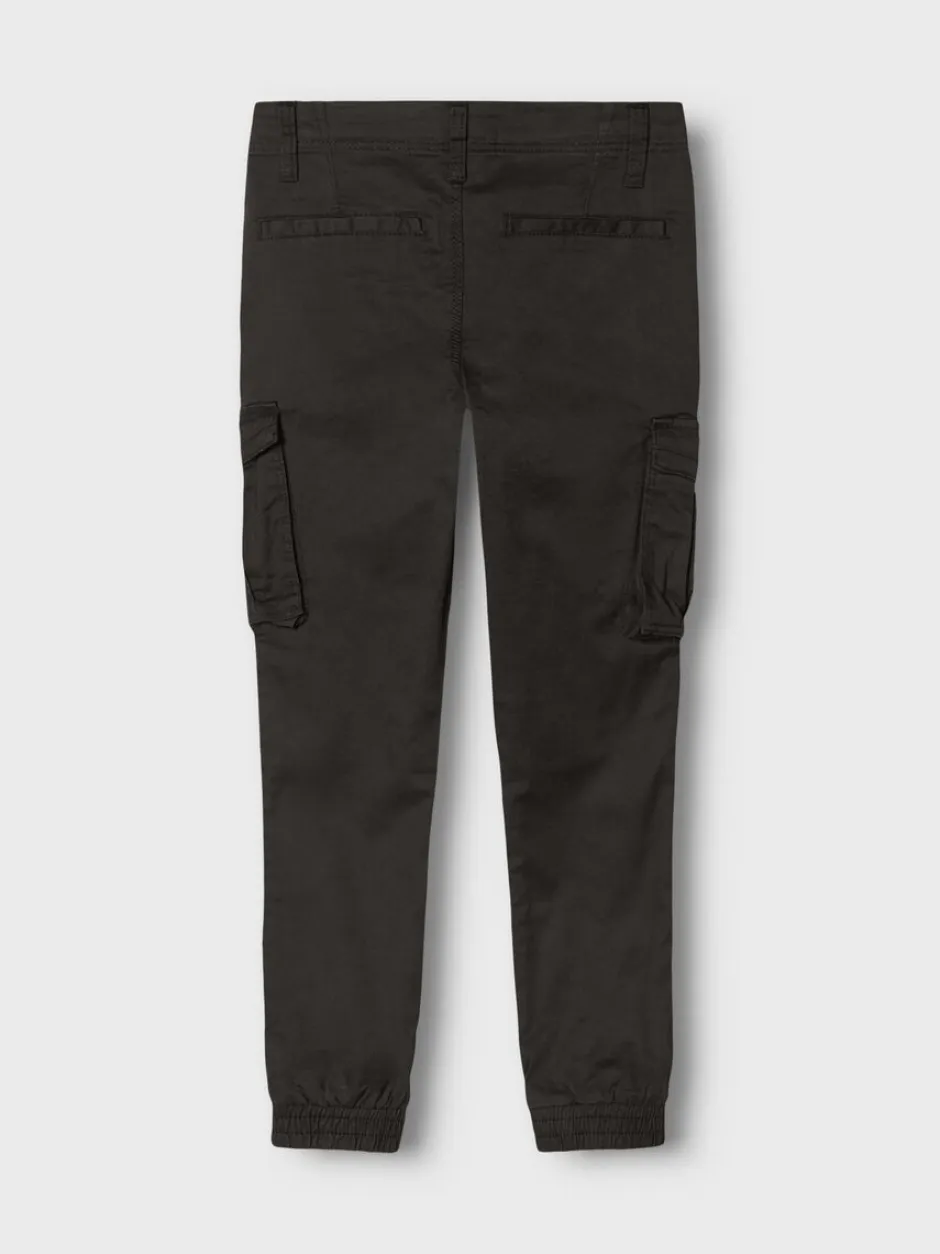Name it rennot twillhousut. Reisitaskuissa neppariläpät ja lahkeissa kuminauhat. Takana koristetaskut.