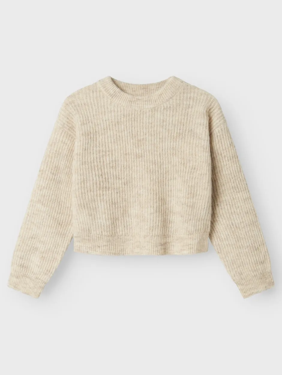 Neuleessa on pyöreä pääntie, pitkät hihat, pudotetut olkapäät ja resorilliset hihansuut.