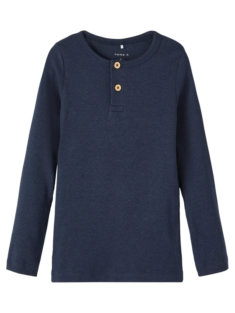 Lasten pitkähihainen trikoopaita, joka on valmistettu pehmeästä ja joustavasta luomupuuvillasekoitteesta. Pyöreä pääntie, ribneulottu pinta ja kaksi nappia edessä.