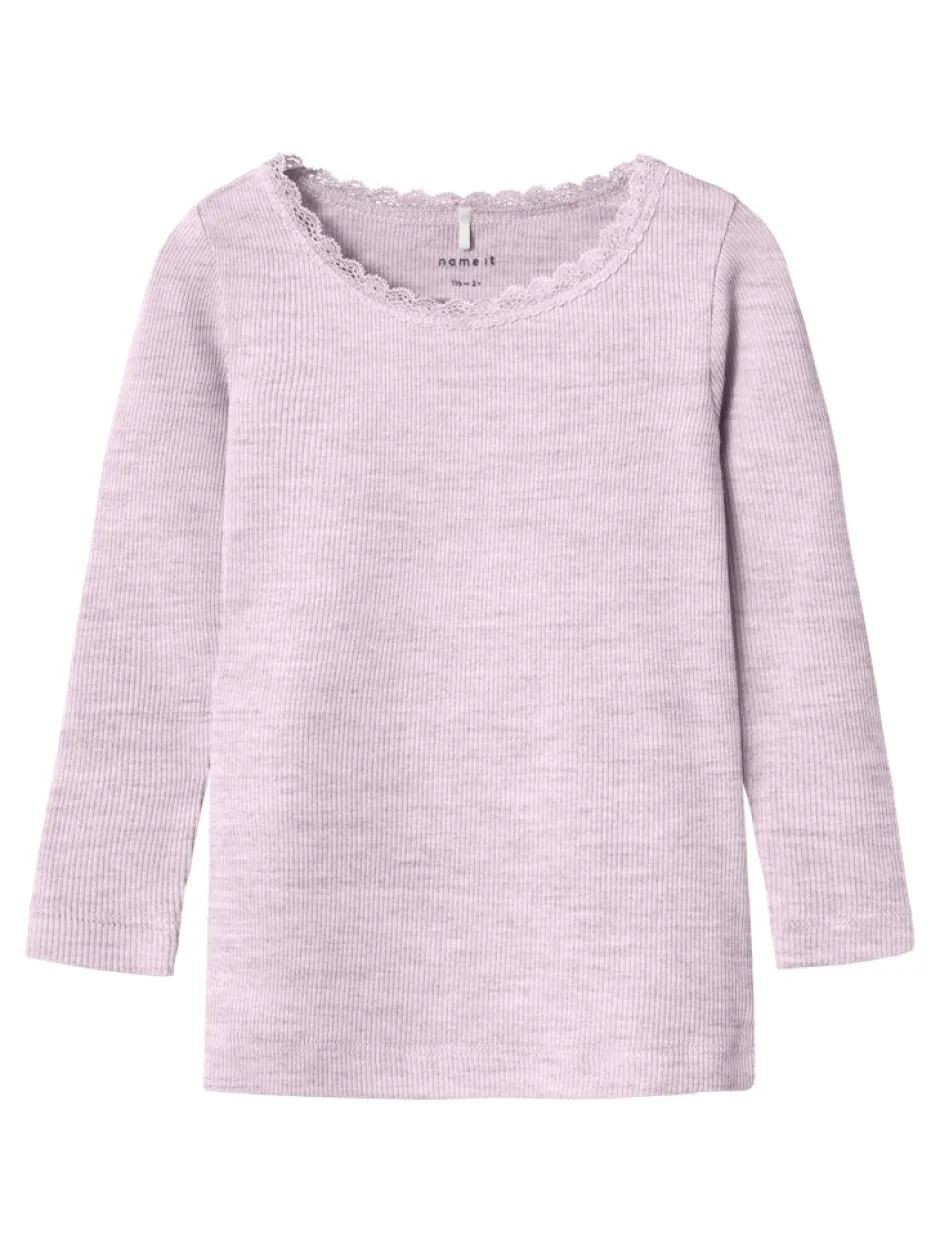 Name It lasten pitkähihainen paita. Paidan pääntiellä kapea pitsi yksityiskohtana.