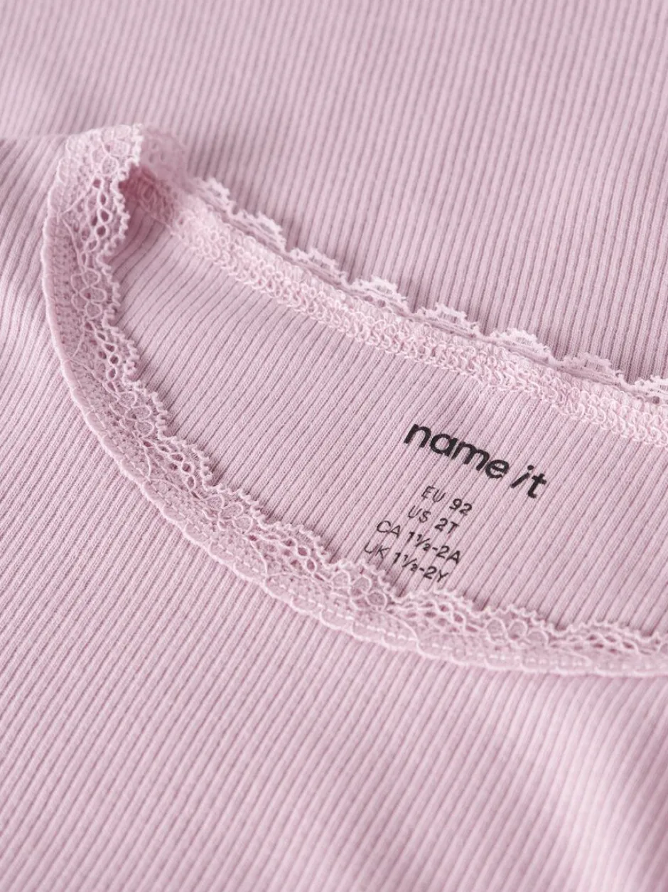 Name It lasten pitkähihainen paita. Paidan pääntiellä kapea pitsi yksityiskohtana.