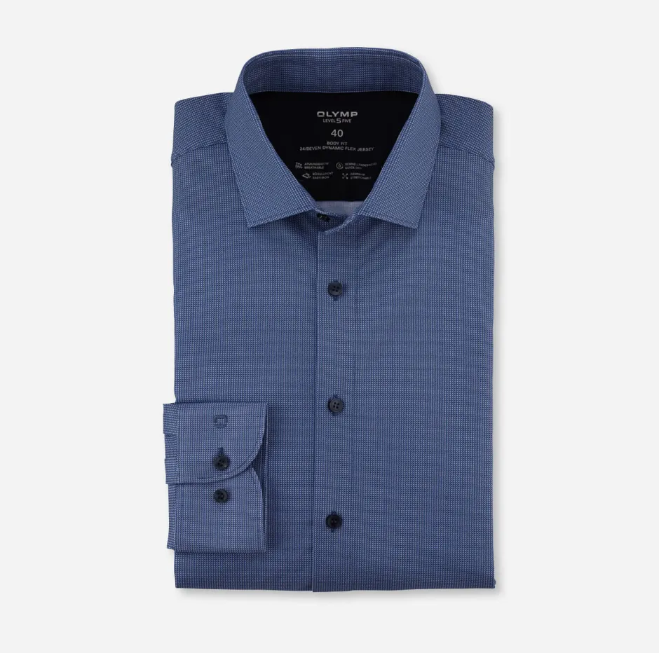 Olymp miesten tyylikäs pitkähihainen kauluspaita. Skarpit kaulukset, napitus edessä ja hihoissa sekä vartalonmyötäinen istuvuus. Kevyt materiaali, joka hengittää ja joka kuivuu nopeasti.