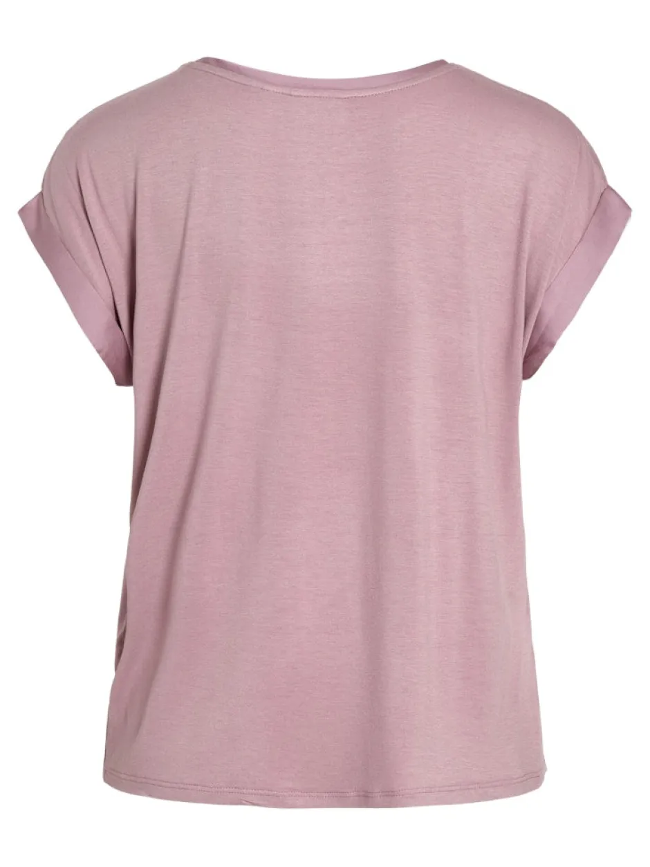 – Lyhythihainen toppi, jossa on pyöreä kaula-aukko – Satiinimainen pinta – Kevyttä materiaalia – Joustamatonta materiaalia – Pituus: 61 cm (koko 38) – Hihojen pituus: 11 cm (koko 38) – Malli on 178 cm pitkä, yllä koko 38.