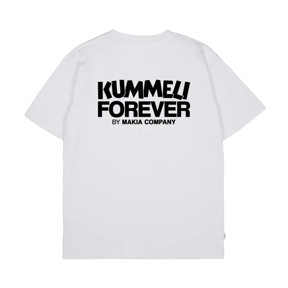 Kummeli Forever by Makia -malliston puuvillainen t-paita, jossa takana näyttävä tekstiprintti Kummeli Forever sekä printti edessä rinnassa. Paidassa pyöreä pääntie ja lyhyet hihat.