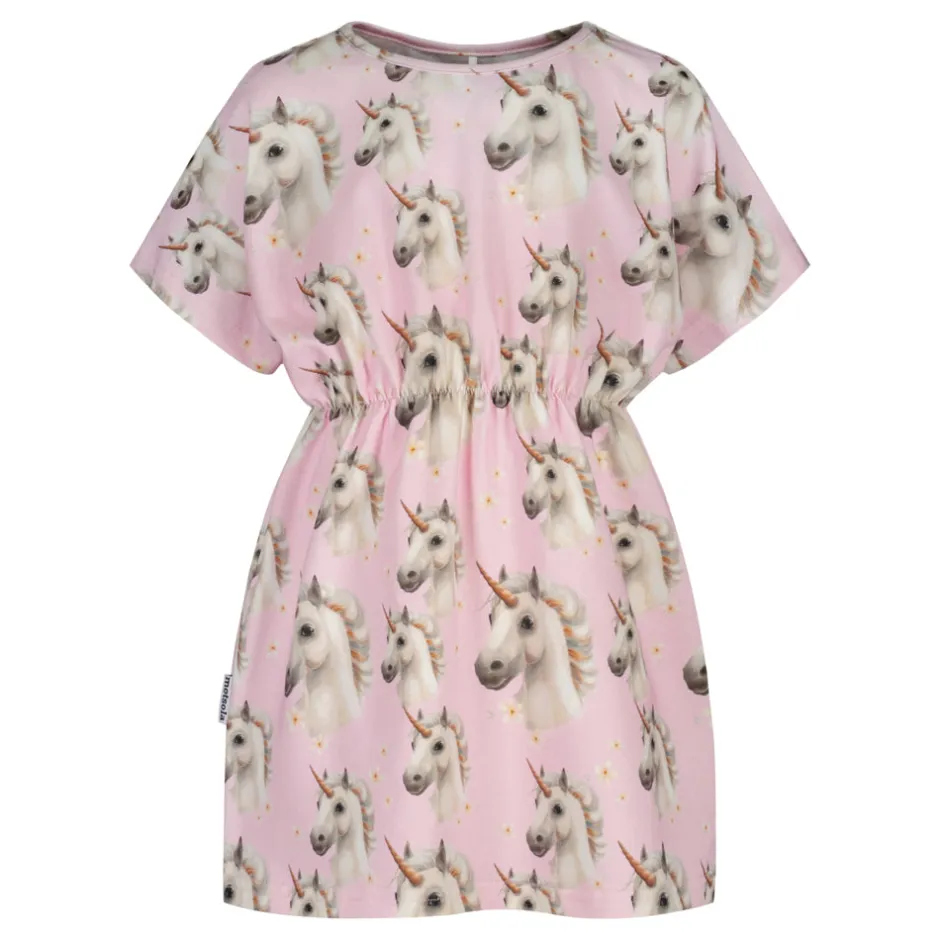Lyhythihainen lasten trikoomekko on valmistettu luomupuuvillasta, joka on materiaalina erittäin miellyttävän tuntuista. Sen lisäksi, että materiaali tuntuu pehmeältä iholla, se on myös joustava ja kestävä laadultaan.