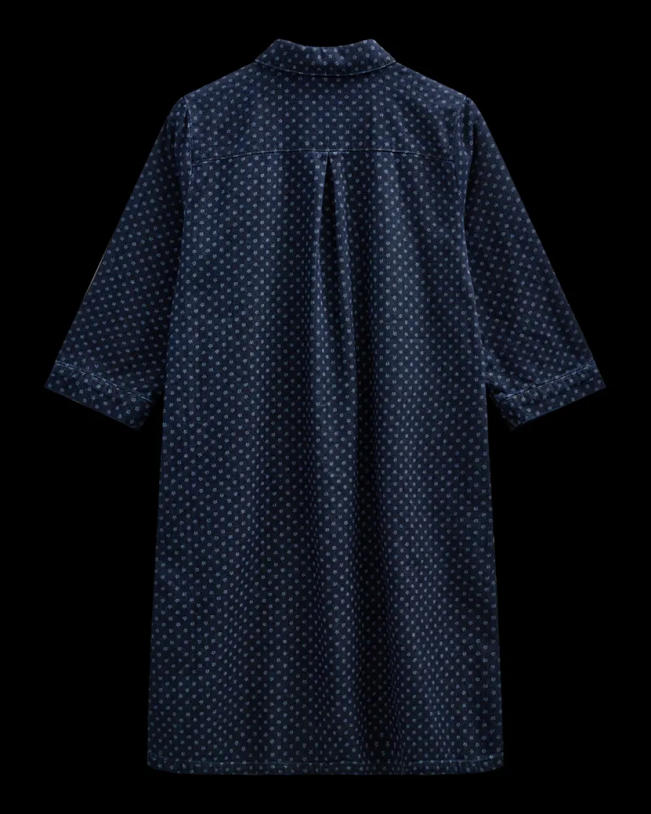 Tämä Freequent Rinna Dress on monipuolinen, tummansininen mekko, jossa yhdistyvät klassinen denim-vaikutelma ja moderni istuvuus. Mekossa on selkeä siluetti, kaunis kaulus sekä napitettava etuosa, jotka antavat ajattoman ilmeen, mutta samalla tekevät mekosta helpon pukea päälle sekä riisua. Selkeä leikkaus ja laskokset takana luovat pehmeän ja kauniisti laskeutuvan helman.