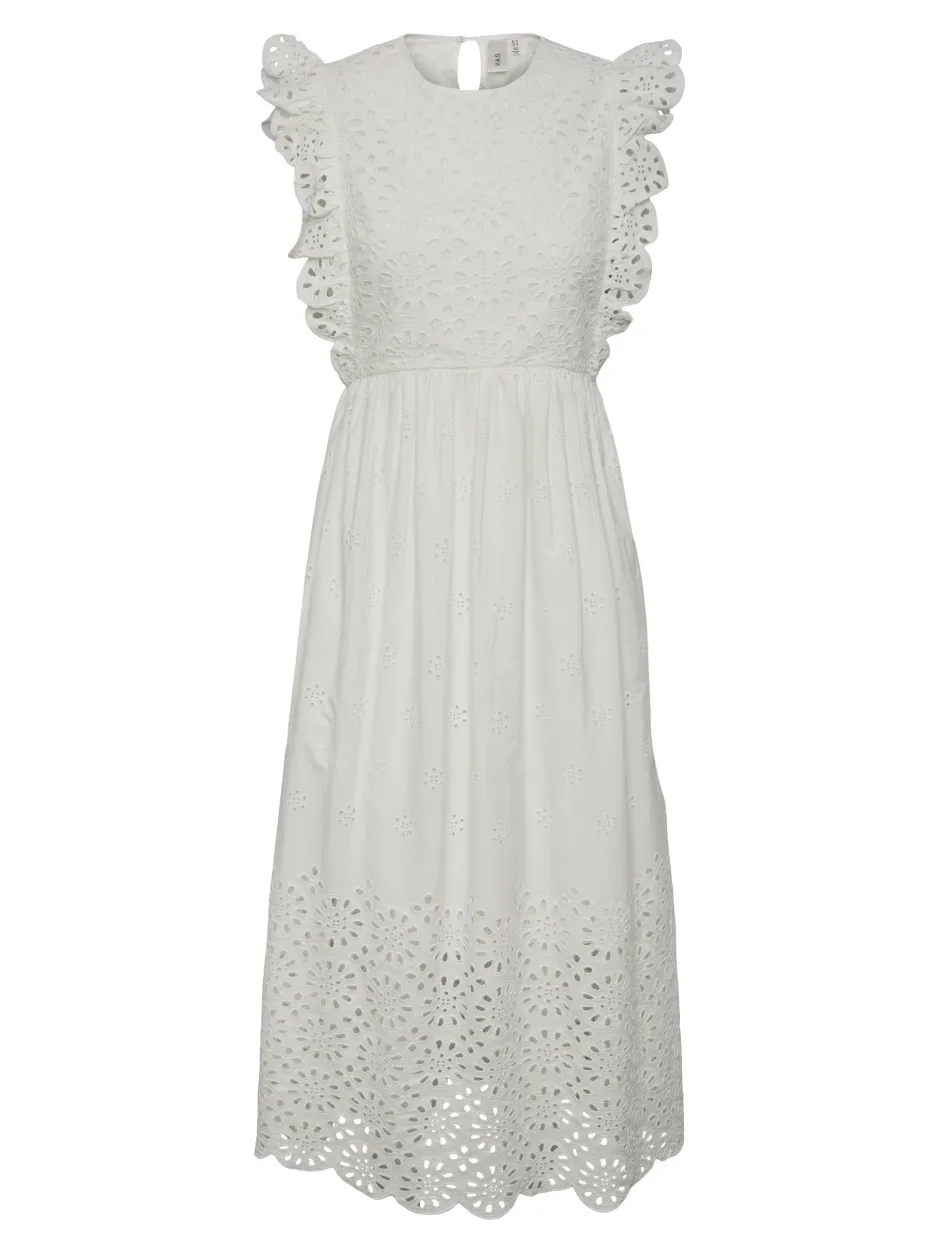 Lisäyksityiskohdat: Vyötäröllä leikkauslinja, röyhelöt naiselliseen reunaan, Broderie anglaise -yksityiskohta