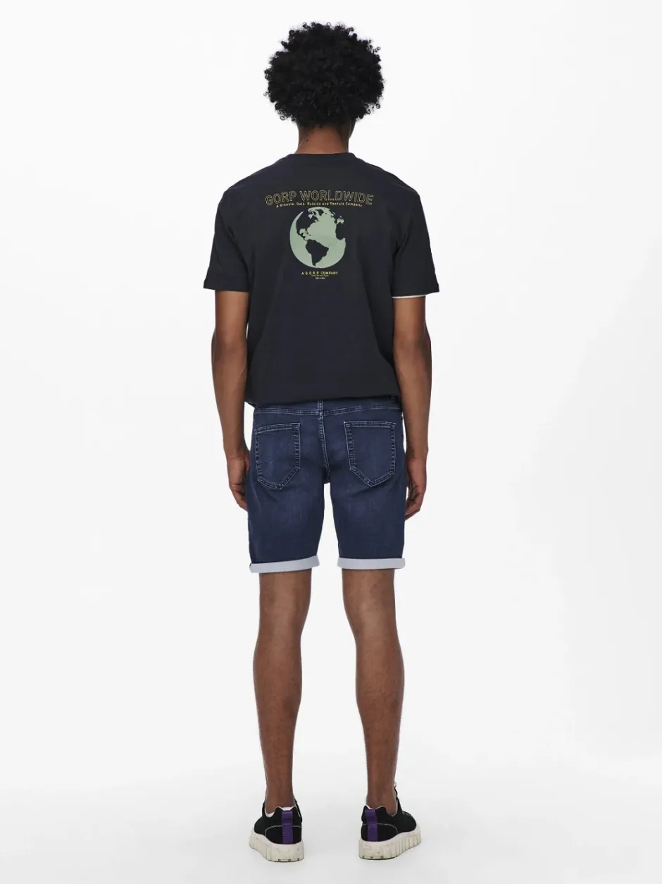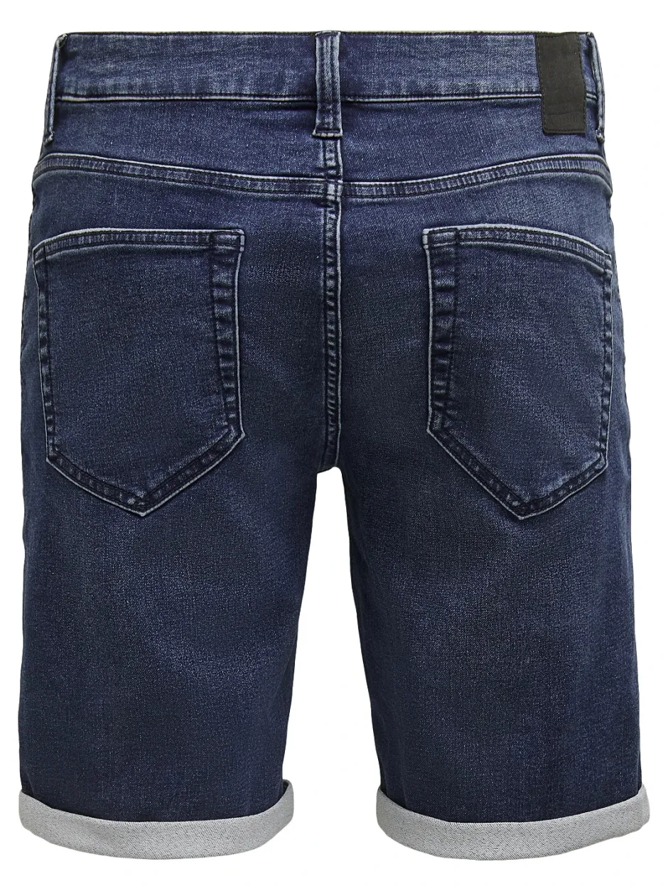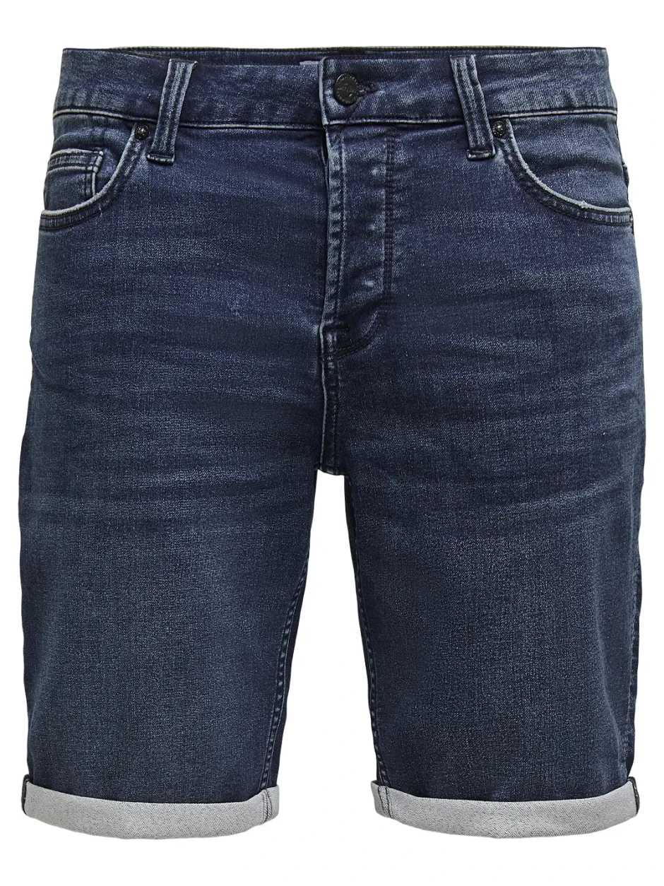 Miesten farkkushortsit. Taskut edessä ja takana. Shortsien lahkeet taitetut.
