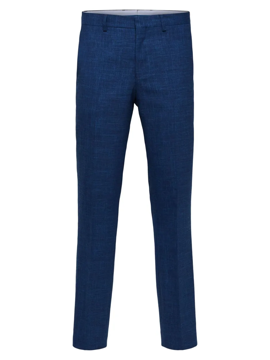 Miesten housut pellavan ja villan sekoitetta, slim fit. Materiaali on hyvin kevyttä ja hengittävää ja elastaanin ansiosta mukavan joustavaa. Sivutaskut, vyölenkit vyötäröllä, edessä vetoketju. Takana napilliset, upotetut taskut. -Kemiallinen pesu