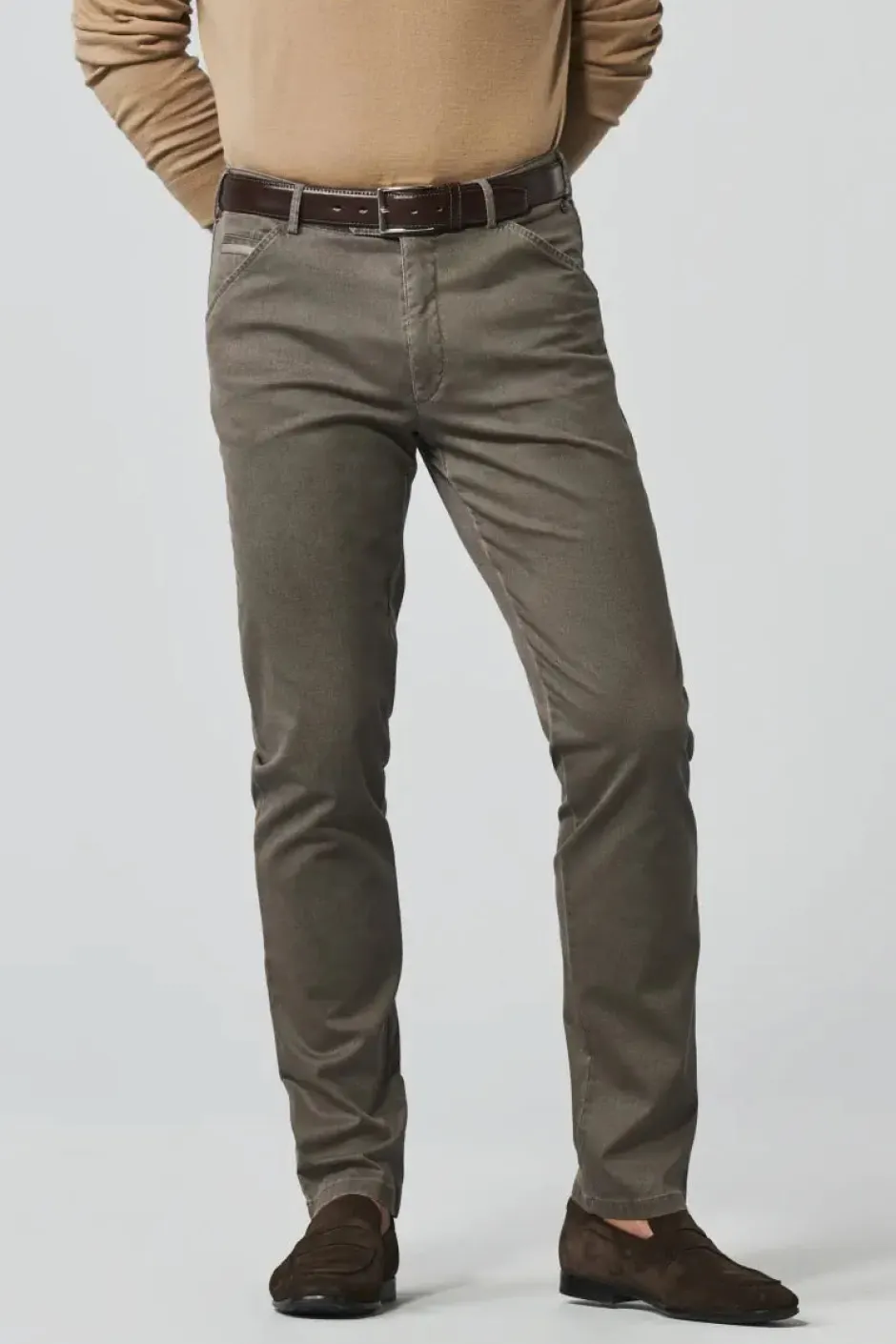 Meyerin chinomaiset housut suorilla lahkeilla. Vetoketju- ja nappikiinnitys.