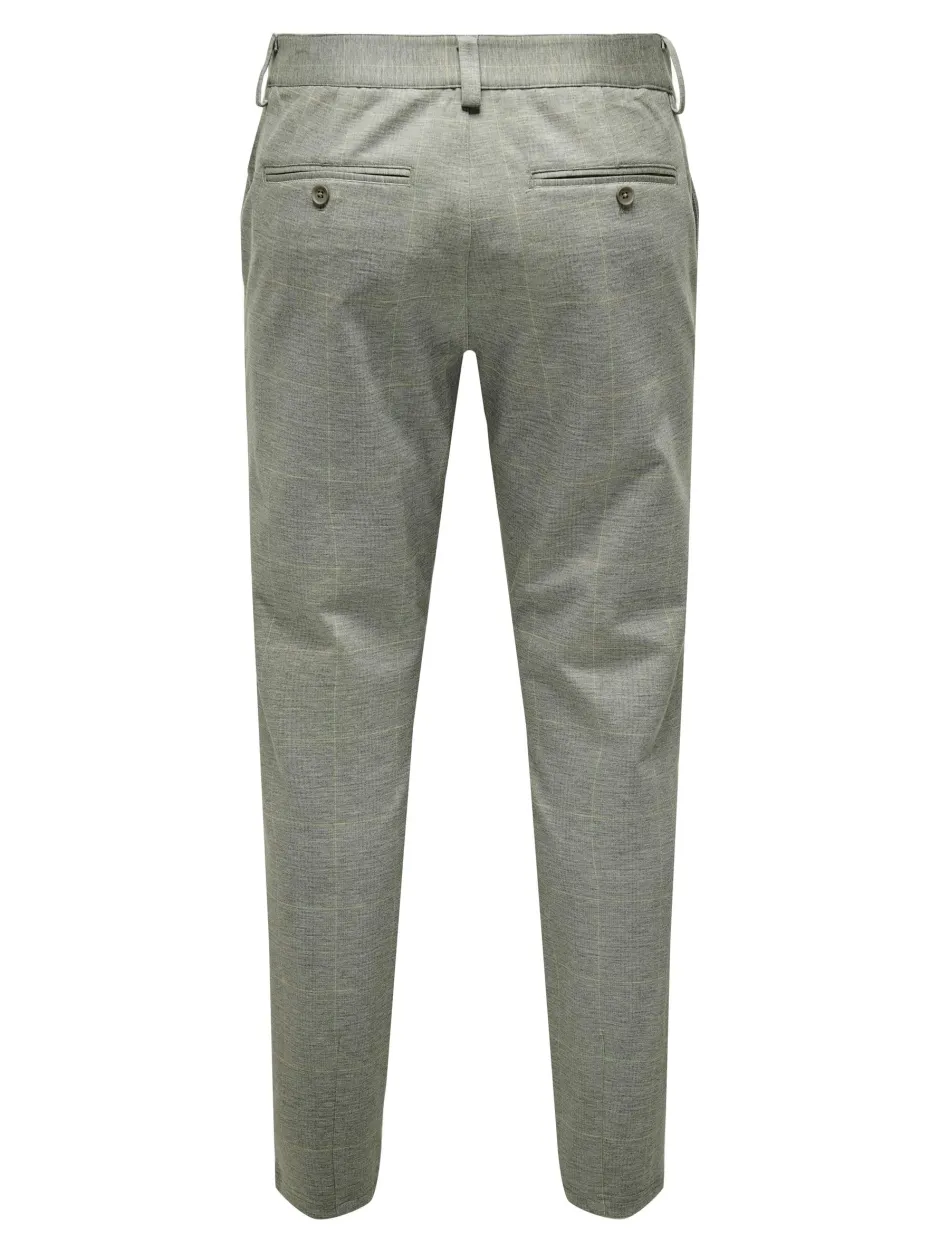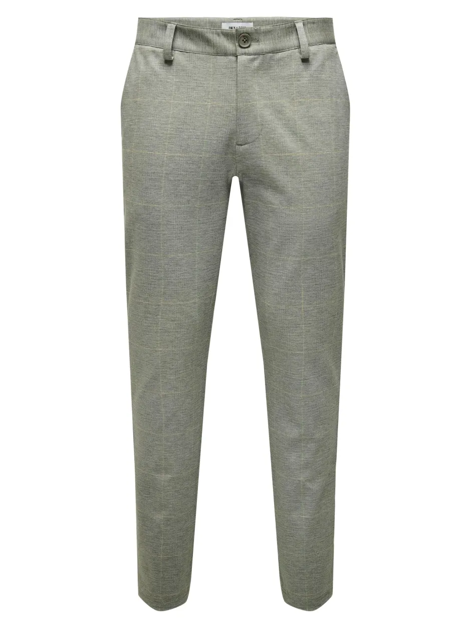 Miesten trendikkäät ruudulliset housut, kapea istuvuus, kapenevat lahkeet. Edessä vetoketju, taskut sivuilla ja takana.