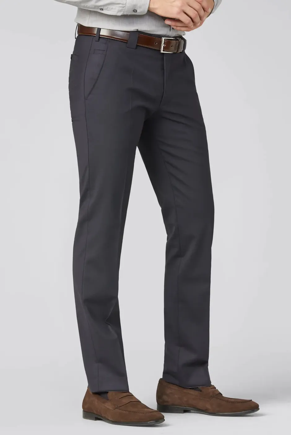 Meyer Roma on hienostunut ja monikäyttöinen housumalli, joka sopii niin bisnes‑ kuin smart casual ‑tyyliin. Huoliteltu leikkaus antaa siistin ja ajattoman ilmeen, kun taas laadukas materiaali takaa kevyen, hengittävän ja miellyttävän käyttötuntuman. Housujen materiaali pitää huolen siitä, että ne laskeutuvat kauniisti ja säilyttävät muotonsa koko päivän — olitpa toimistolla, kokouksessa tai vapaa-ajalla kaupungilla. Hyvin suunnitellut taskut, täydellisesti istuva vyötärö ja viimeistellyt saumat tekevät näistä housuista varman valinnan vaatekaappiin, jossa laatu kohtaa tyylin.