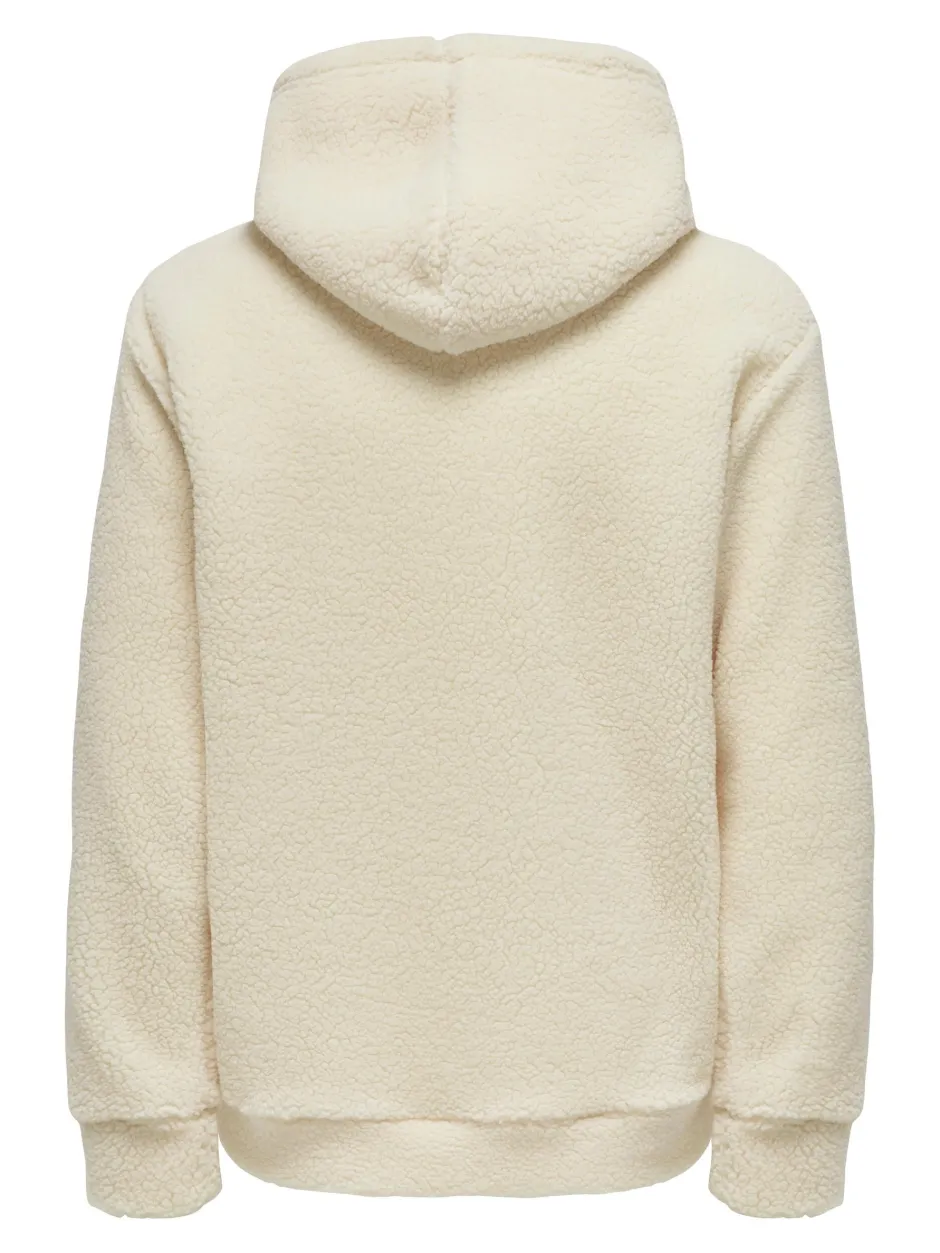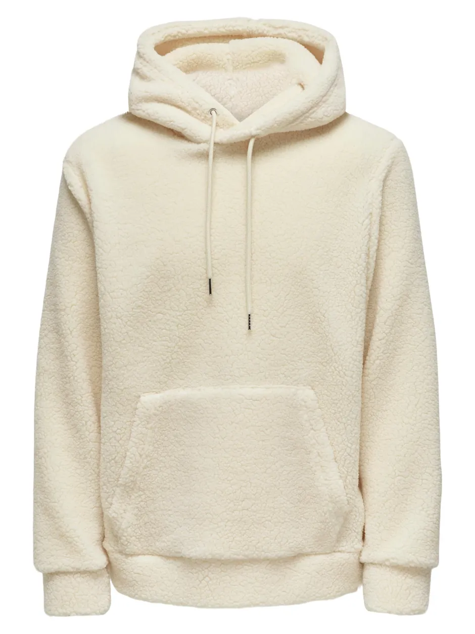 Miesten pehmeä teddypintainen huppari, pudotetut olkapäät ja kengurutasku edessä. Normaali istuvuus, pehmeä pinta ja kiristettävä huppu.