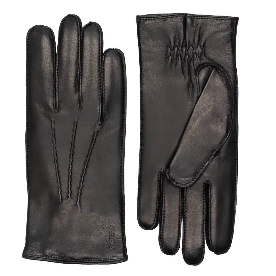 Miesten mustat lammasnappa käsineet, joissa varsi hieman pidempi, vasta sauma, rannekuminauha ja 3 käsin ommeltua koristeommelta päällipuolella. 100% villavuori.