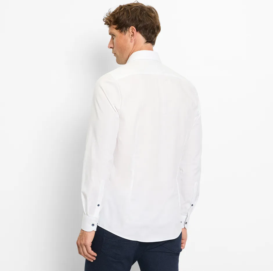 Tämä yksivärinen OLYMP-business-paita on klassisen valkoinen ja siinä on muodikkaat kontrastivärit kauluksessa ja hihansuissa. Se sopii täydellisesti yhteen OLYMPin rentojen vaatteiden kanssa. Hienorakenteinen ja minimaalisesti joustava puuvillakangas on ihoystävällistä, muotonsa säilyttävää ja hengittävää. New York Kent -kaulus, vartalonmyötäinen ja erityisen helppo silittää.
