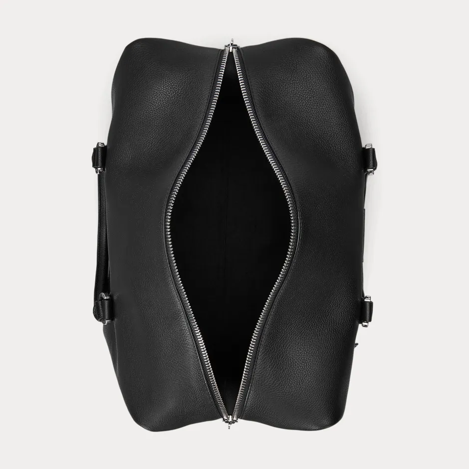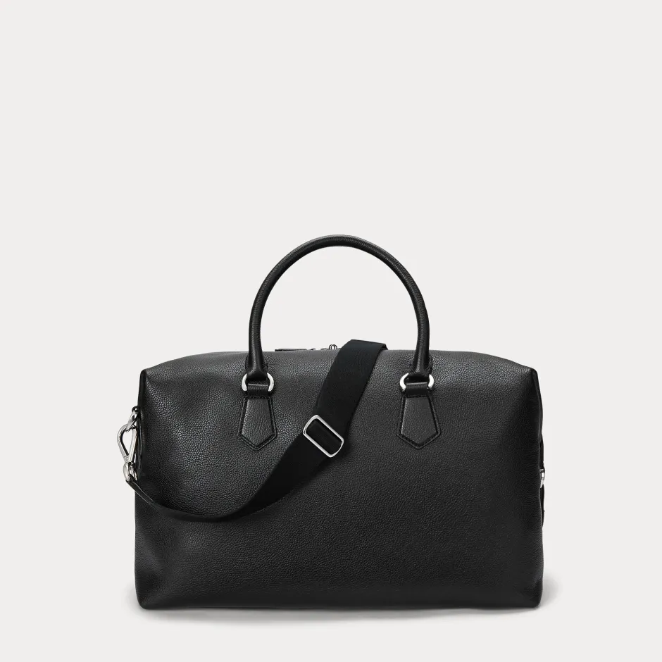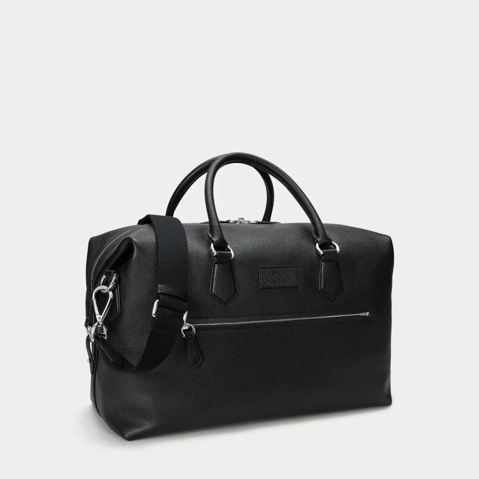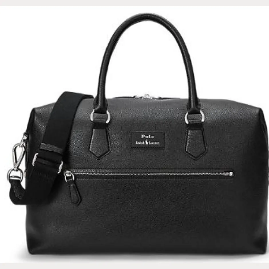Kaksi nahkaista kantokahvaa, kummassakin 13 cm laskos. Irrotettava, säädettävä olkahihna. Kaksisuuntainen vetoketjukiinnitys päällimmäisenä nahkaisilla vetoketjun vetimillä. Vetoketjullinen etutasku. Sivussa vetoketjullinen kenkälokero. Vetoketjullinen sisätasku. Edessä Polo Ralph Lauren -logo ja tunnusomainen poni-merkki. Vahvistettu pohja. Vuorattu twillikankaalla. Mitat 35,4 cm K x 41,5 cm P x 18,2 cm S