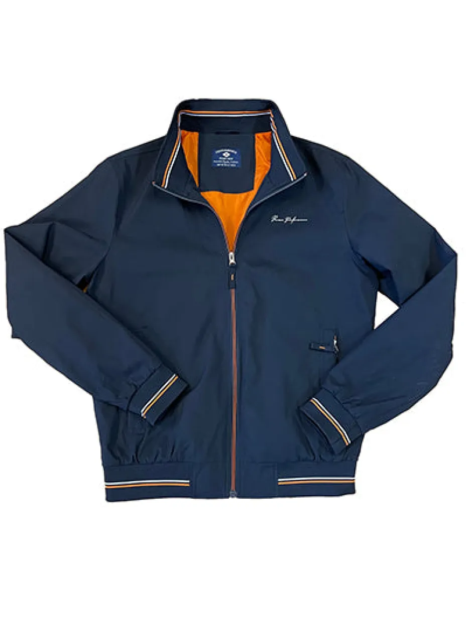 tummansininen miesten takki, jossa on vetoketjukiinnitys. Takissa on kontrastivärinen oranssi vuori, mikä tuo siihen tyylikkään yksityiskohdan. Hihansuissa, kauluksessa ja helmassa on raidalliset resorit, jotka lisäävät urheilullista ilmettä. Oikealla rintapuolella näkyy brodeerattu brändilogo tai nimikirjoitus. Takki on kevyt ja sopiii rentoon tai urheilulliseen käyttöön.