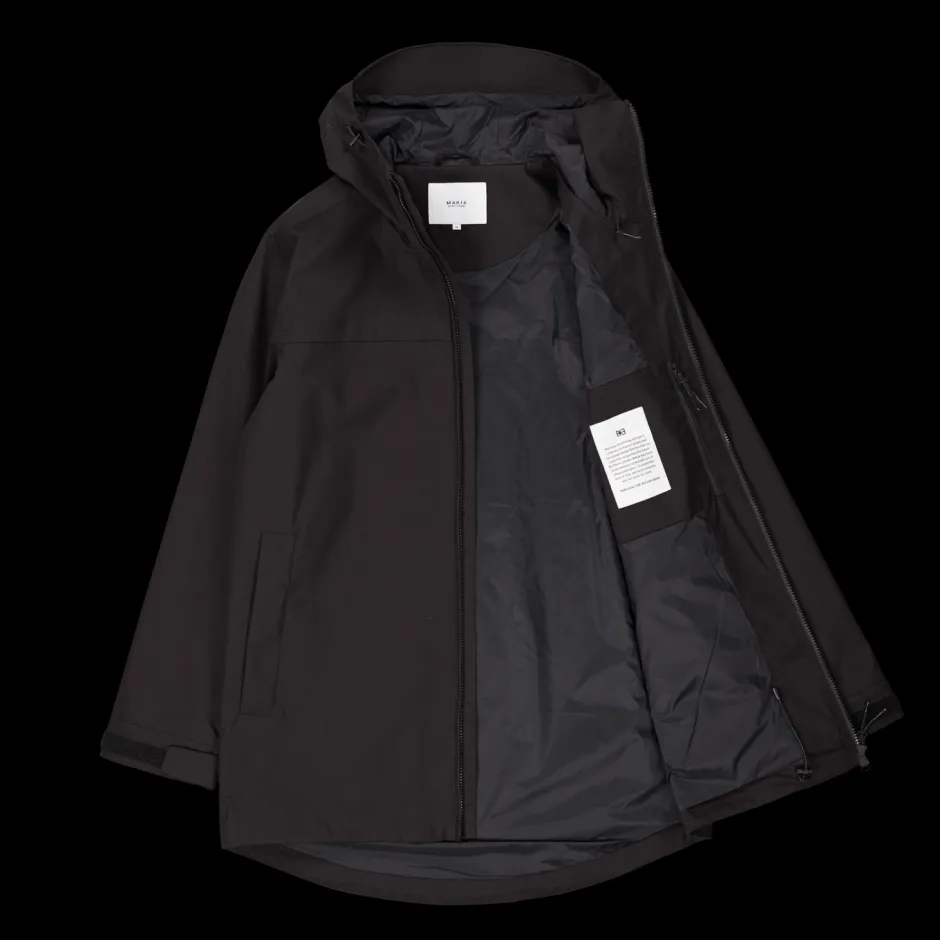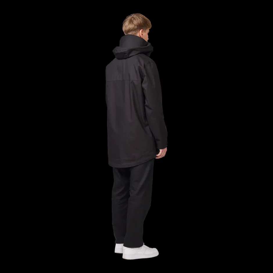 Makia miesten ympärivuotinen takki. – Keskipitkä – Normaali istuvuus – Laminoitu säädettävä hupun reuna – Kudottu logo rinnassa – Tarranauhat hihoissa