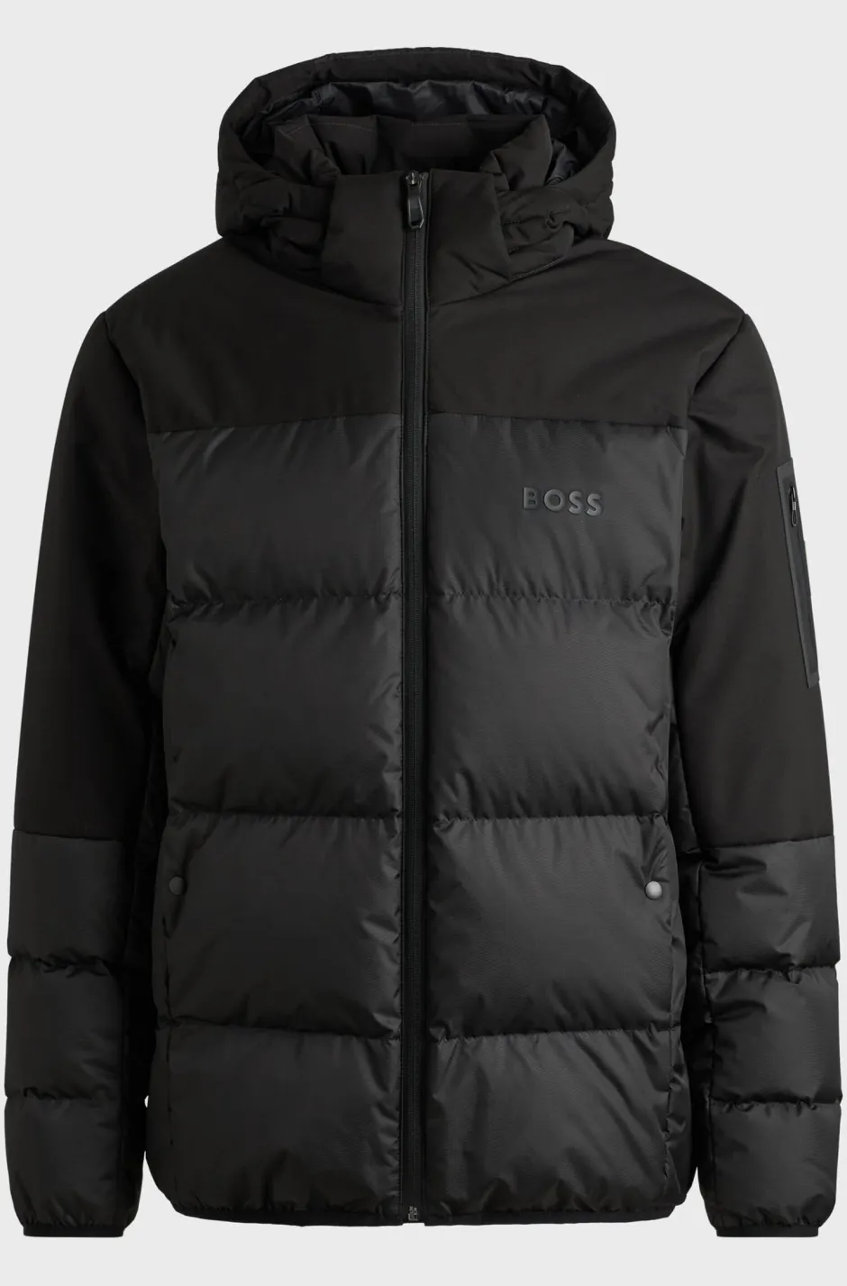 Innovatiivinen BOSS-takki, joka on täytetty sertifioidulla ankanuntuvalla ja -höyhenillä kevyttä lämpöä varten. Tämä vedenpitävä takki sisältää irrotettavan hupun.