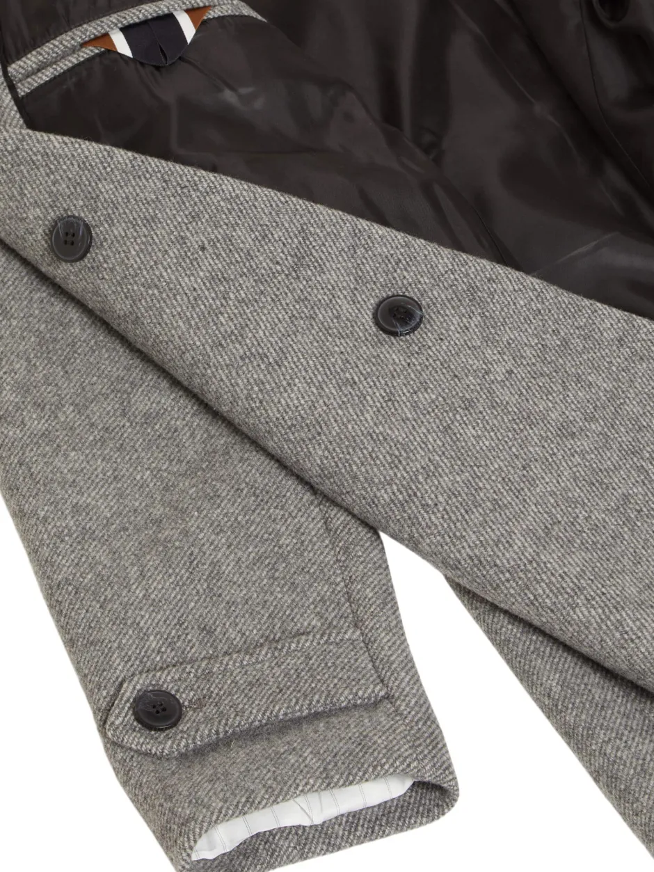 Selectedin miesten korkeakauluksinen villakangastakki. – Korkea kaulus – Napitetut hihansuut – Nappikiinnitys – Mitoitus polven yläpuolelle – Sivutaskut