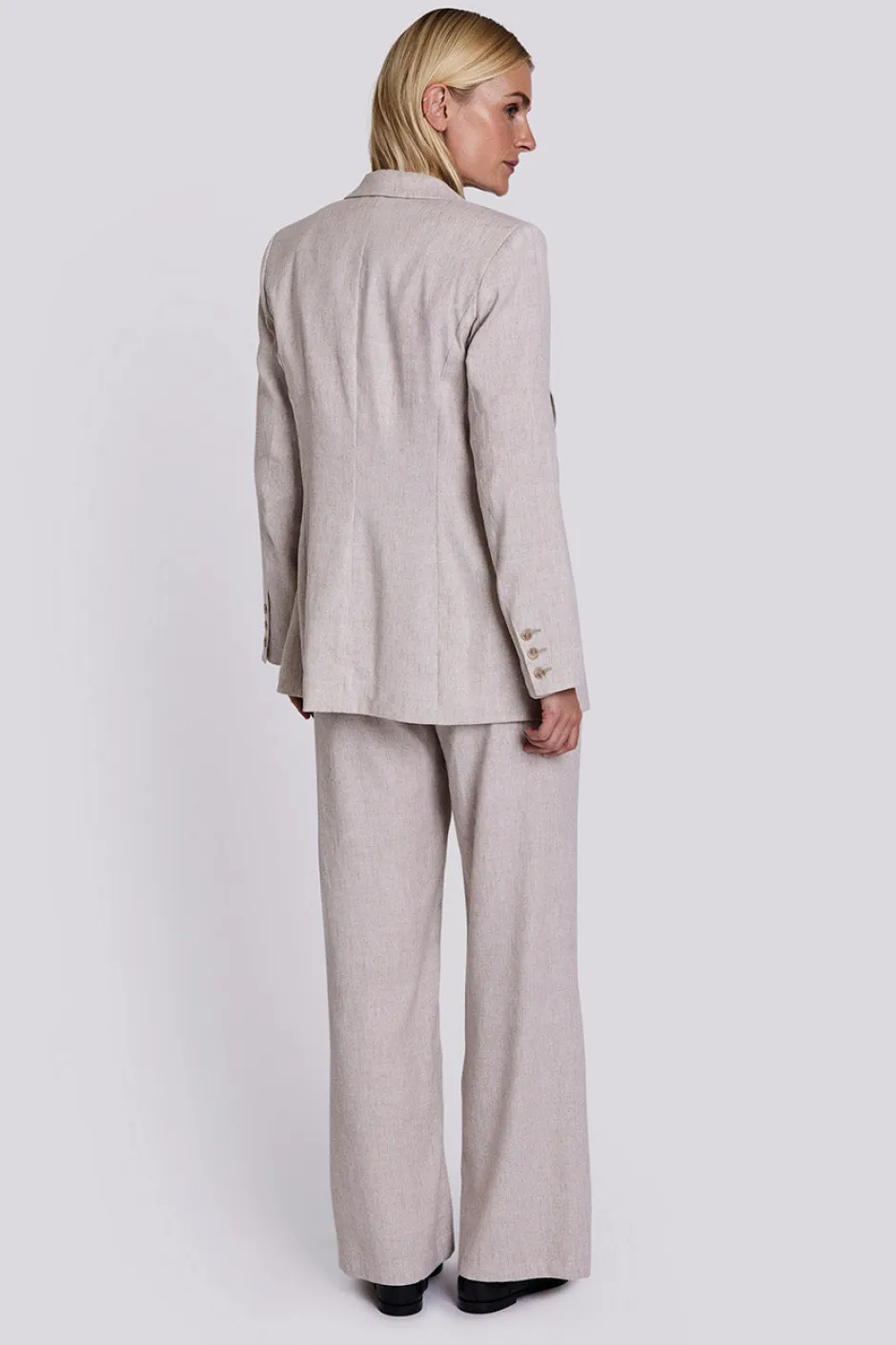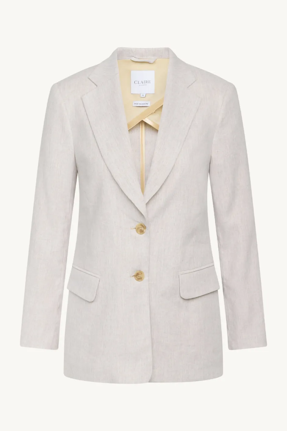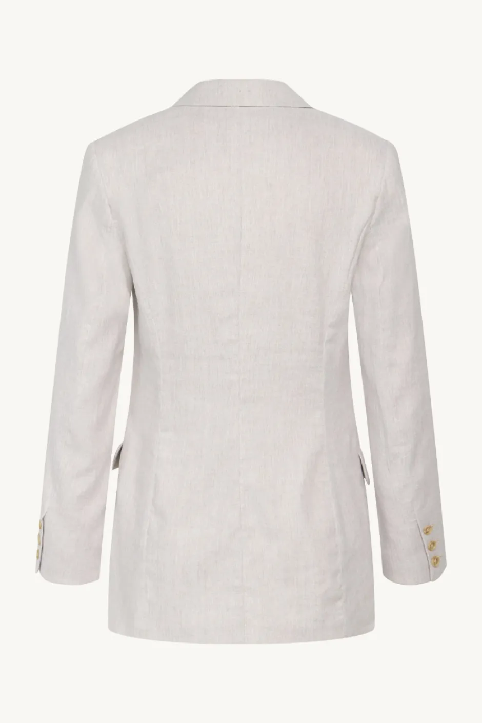 Puolivuorattu bleiseri, jossa etutaskut, topatut olkapäät ja nappikiinnitys.