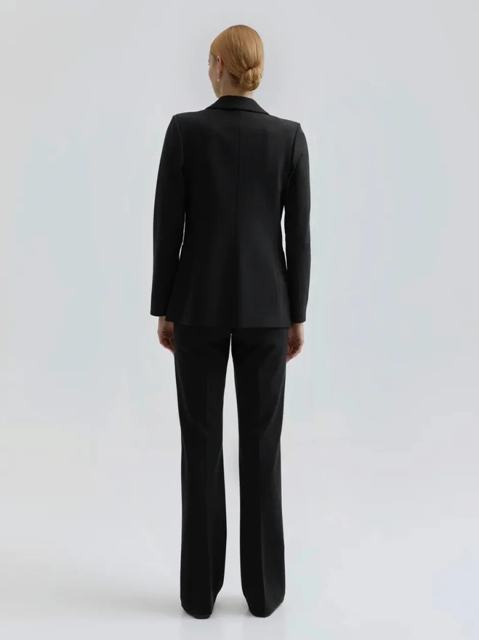 Andiata naisten tyylikäs bleiseri pidemmällä helmalla. Kultaiset napit kahdessa rivissä ja edessä paikkataskut. Joustava ja ryhdikäs kangas, joka tuntuu päällä miellyttävältä.