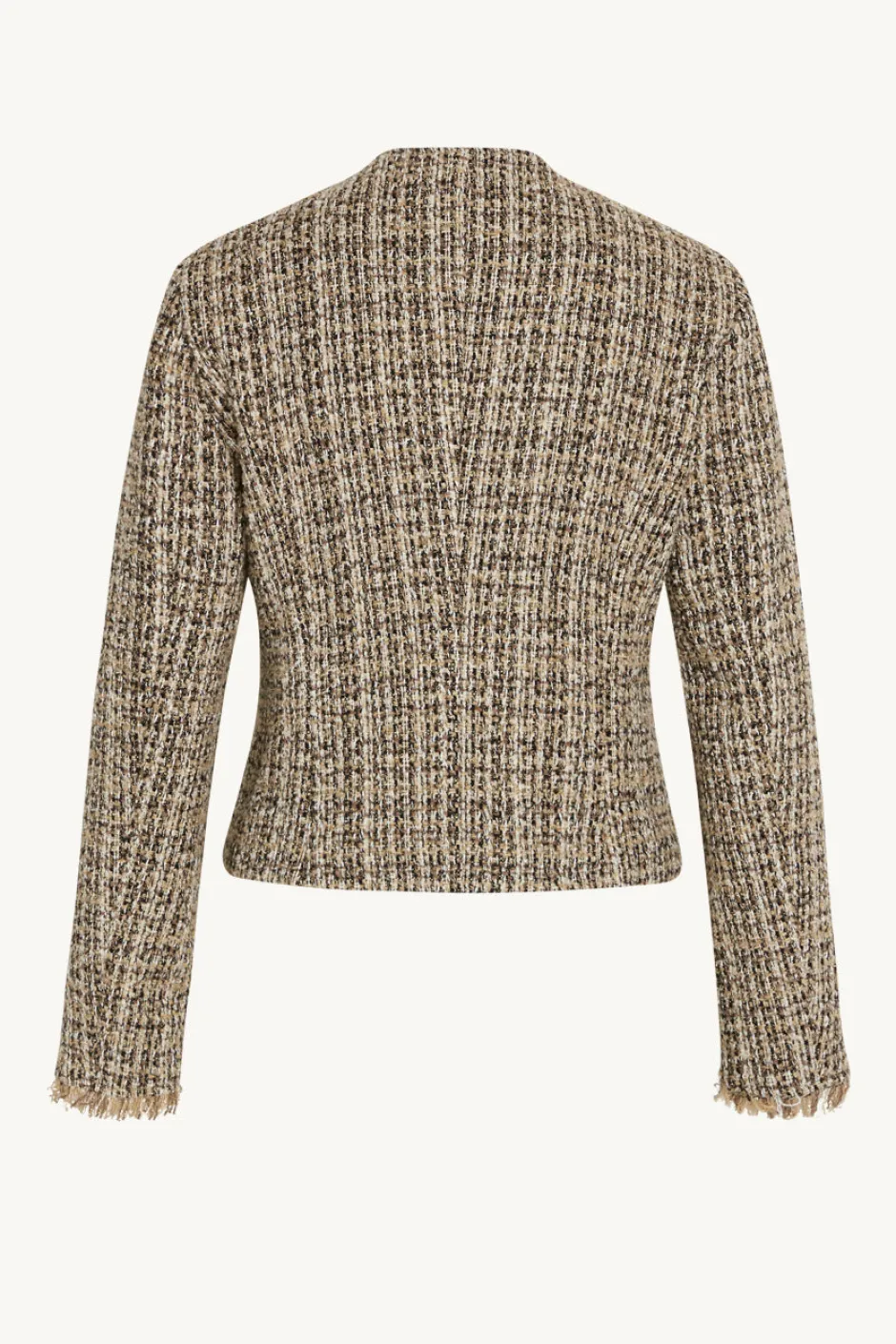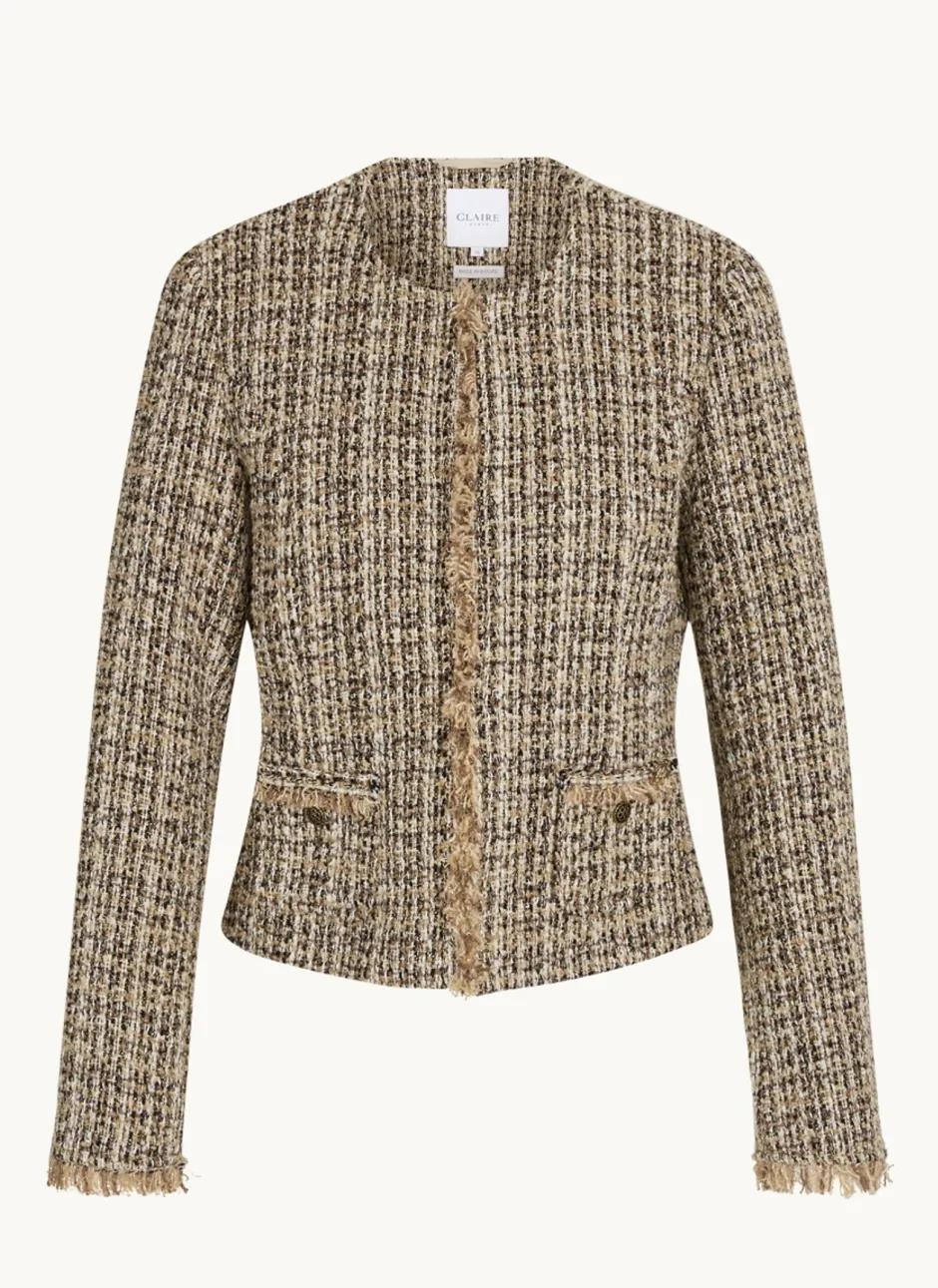Puolivuorattu bouclé-takki, jossa röyhelöyksityiskohdat ja etutaskut. Vaatteessa on tarranauhakiinnitys edessä
