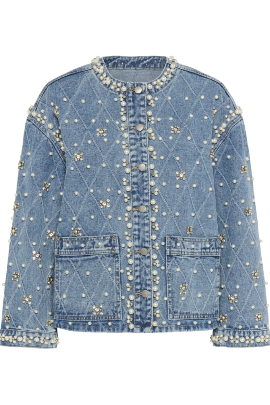 Upea katseenkiinnittäjä farkkutakki, jota koristaa timantit ja helmet. VÄljä ja suora malli, jossa pyöreä pääntie ja pitkät hihat.