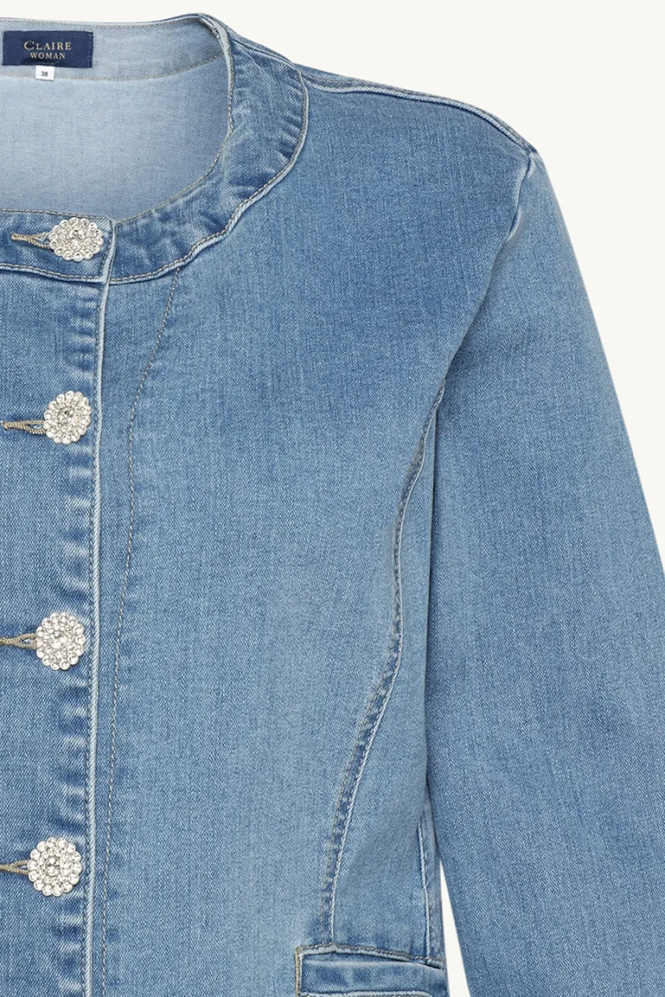 Denimtakki pyöreällä pääntiellä ja etutaskuilla. Takissa on kauniit tekojalokivinapit ja koristeelliset hapsut hihoissa ja helmassa.