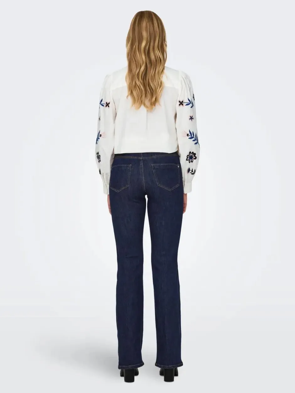 Onlyn korkeavyötäröiset farkut falred fit mallissa. Napakka istuvuus lantion ja reiden kohdalla, polvesta alaspäin levenevä.