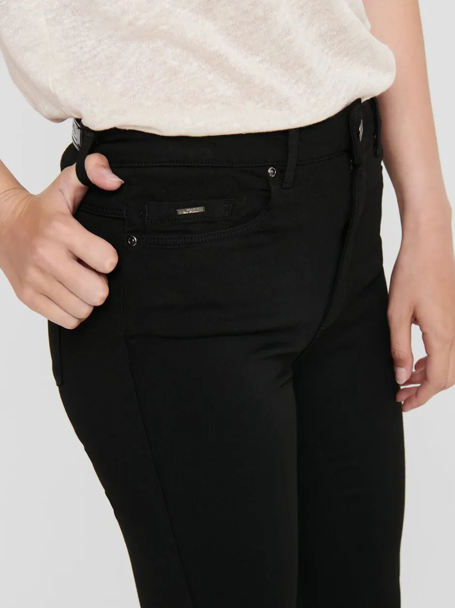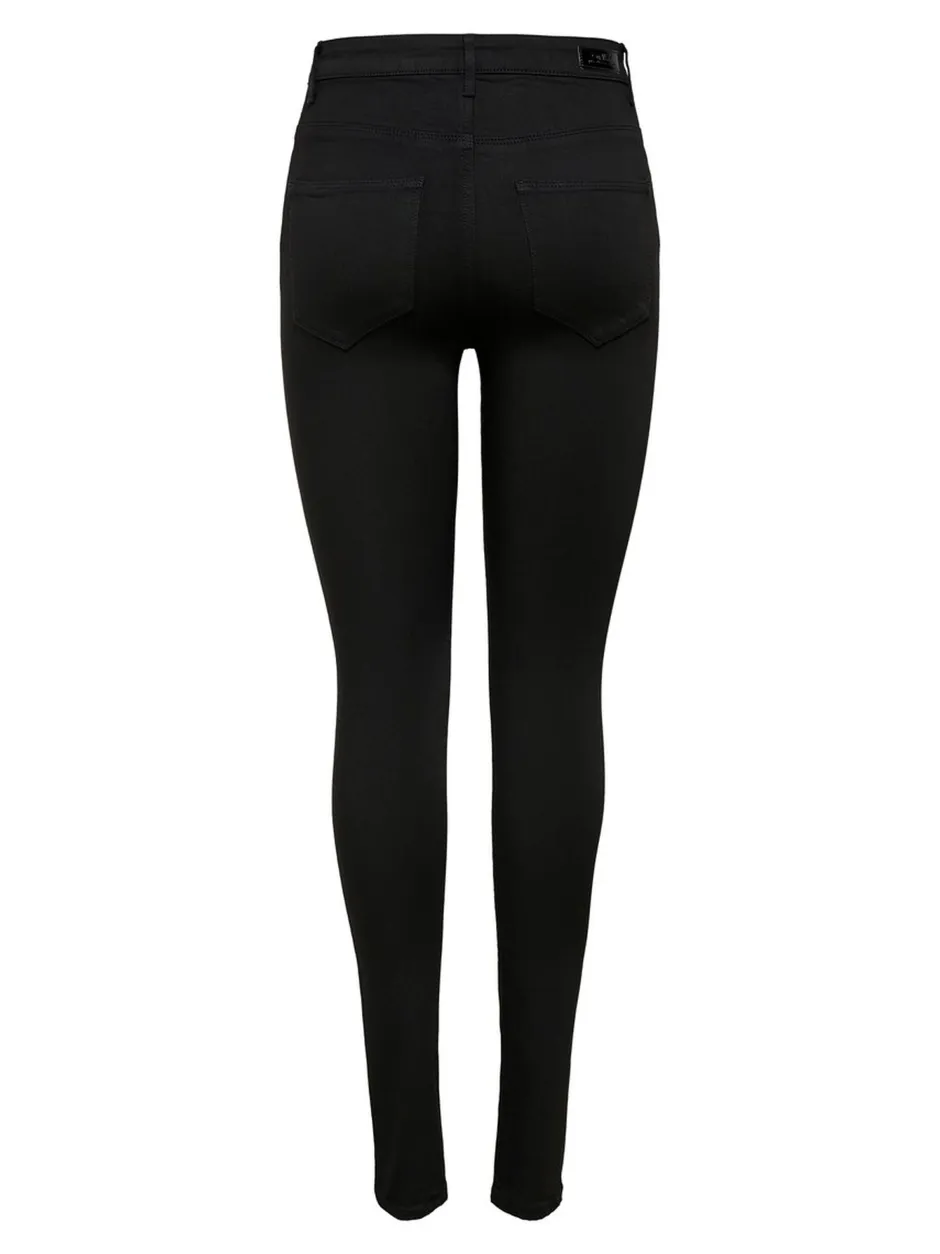 Onlyn yksiväritset, kapealahkeiset farkut. Klassinen 5-taskumalli, joustava materiaali ja korkea vyötärö.