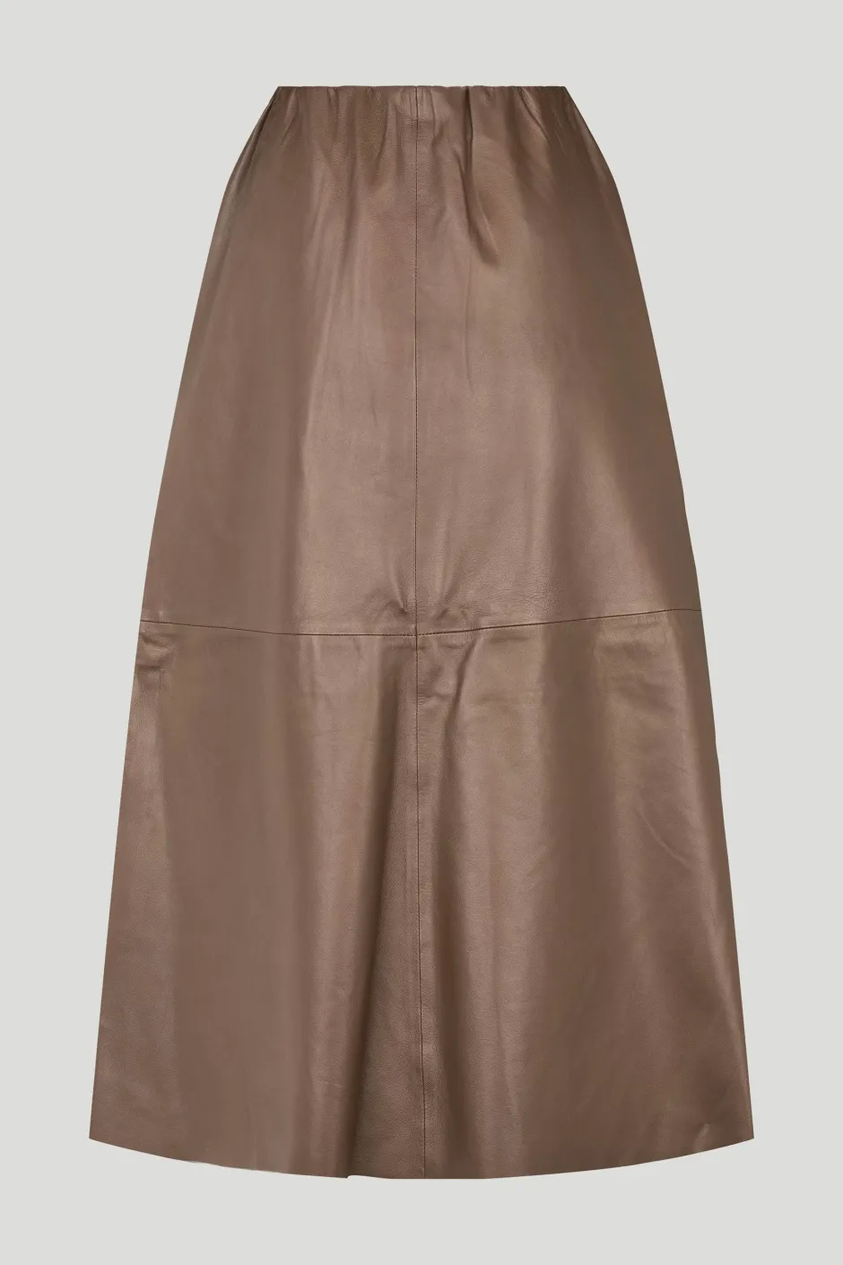 Lapa on A-linjainen nahkahame, jossa on hieman levenevä vyötärö ja joustava vyötärö. Malli yhdistää pehmeän tekstuurin eleganttiin volyymiin.