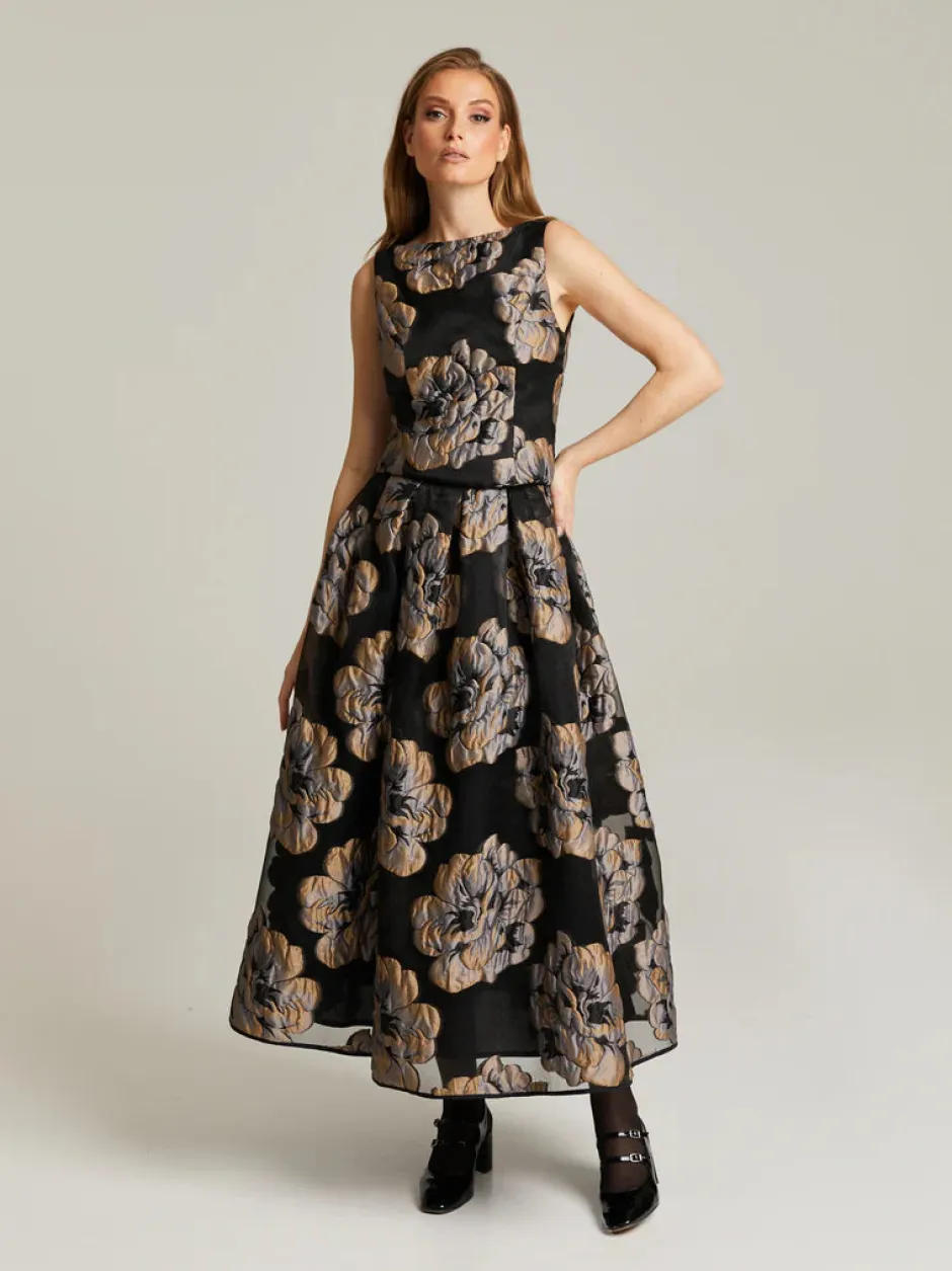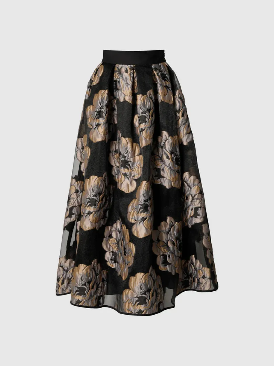 Pohjemittainen hame, jossa näyttävä helma ja laskostukset. Valmistettu ylellisestä ruusukuosisesta cloque-kankaasta. Piilovetoketju sivussa. Hameessa on vuori.
