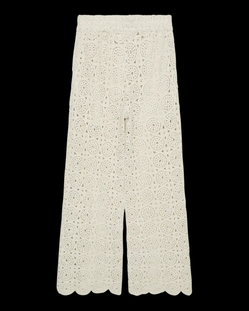 CMCROCHET-PANTS -housut ovat ensiluokkaisesta puuvillamateriaalista valmistetut virkatut housut, joissa on vuori reisien puoliväliin asti. Lisäksi niissä on joustava vyötärönauha, sivutaskut ja simpukankuorilla koristellut reunat suorissa lahkeissa.