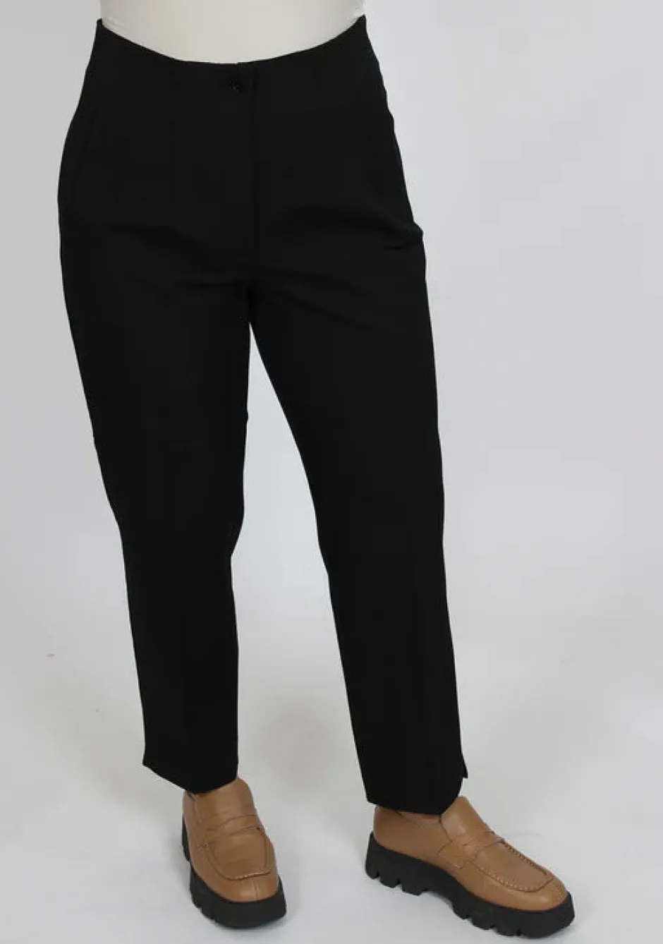 Isay naisten tyylikkäät korkeavyötäröiset suorat housut. Housujen lahkeissa pienet taitokset. Housut ovat joustavat materiaaliltaan.