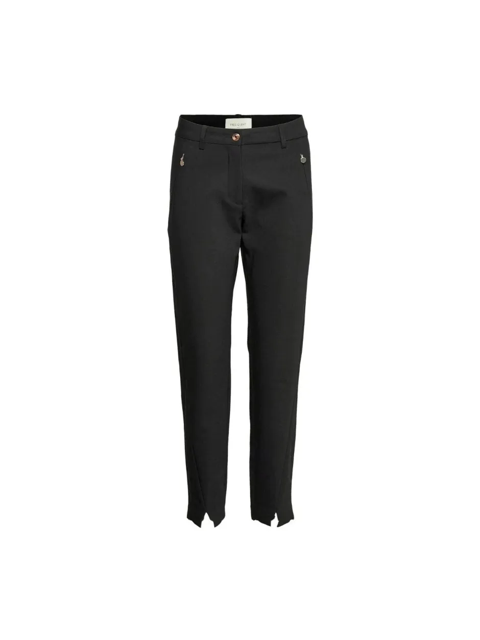 Naisten kapealinjaiset joustavat housut. Lahkeensuissa pienet halkiot. Edessä vetoketjulliset taskut.