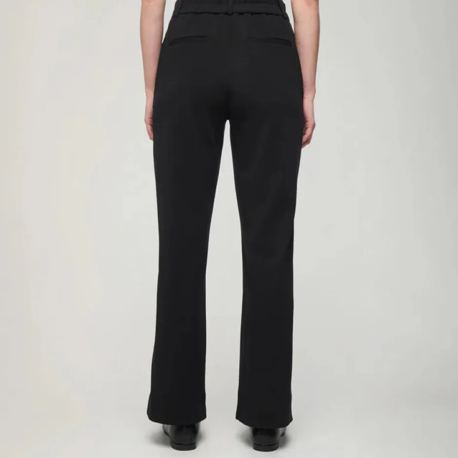 Mustissa Mereta-housuissa on suorat lahkeet ja korkea vyötärö. Leveässä vyötärökaitaleessa on jousto housun takaosassa, mikä takaa mukavan istuvuuden. Housujen materiaali on kauniisti laskeutuvaa, paksua trikoota ja kokonaisuuden viimeistelee vyötärön etuosan aito helmiäisnappi.