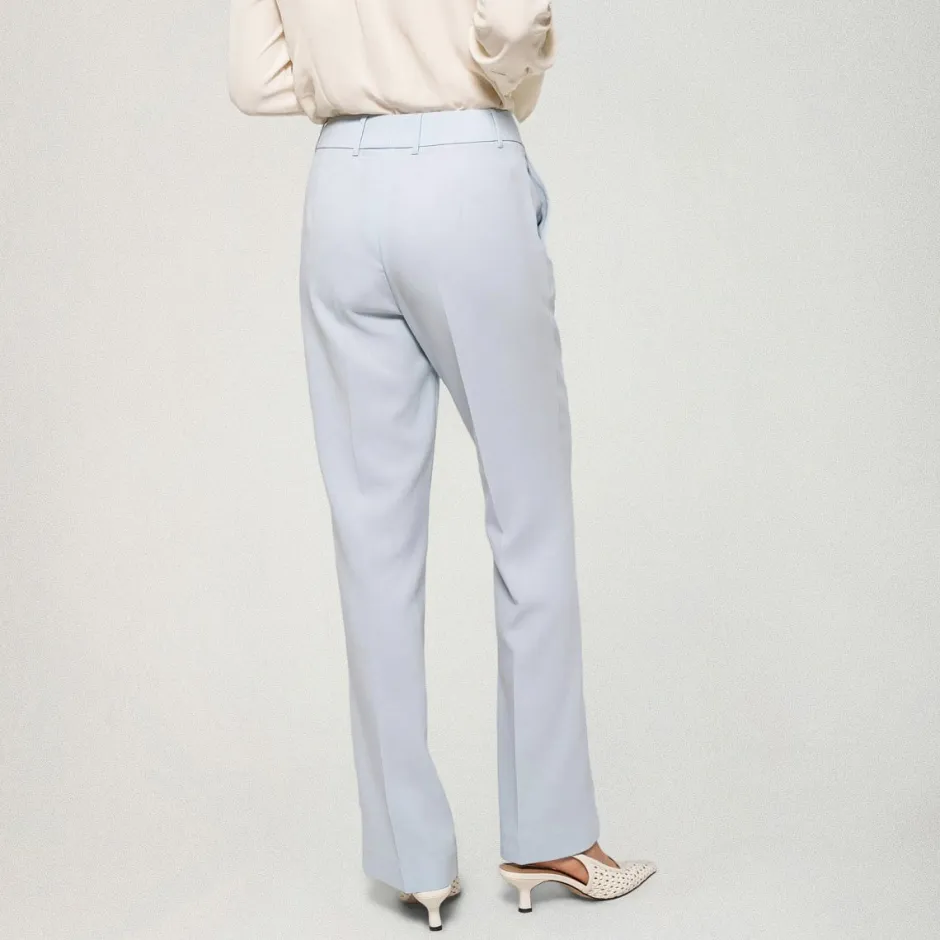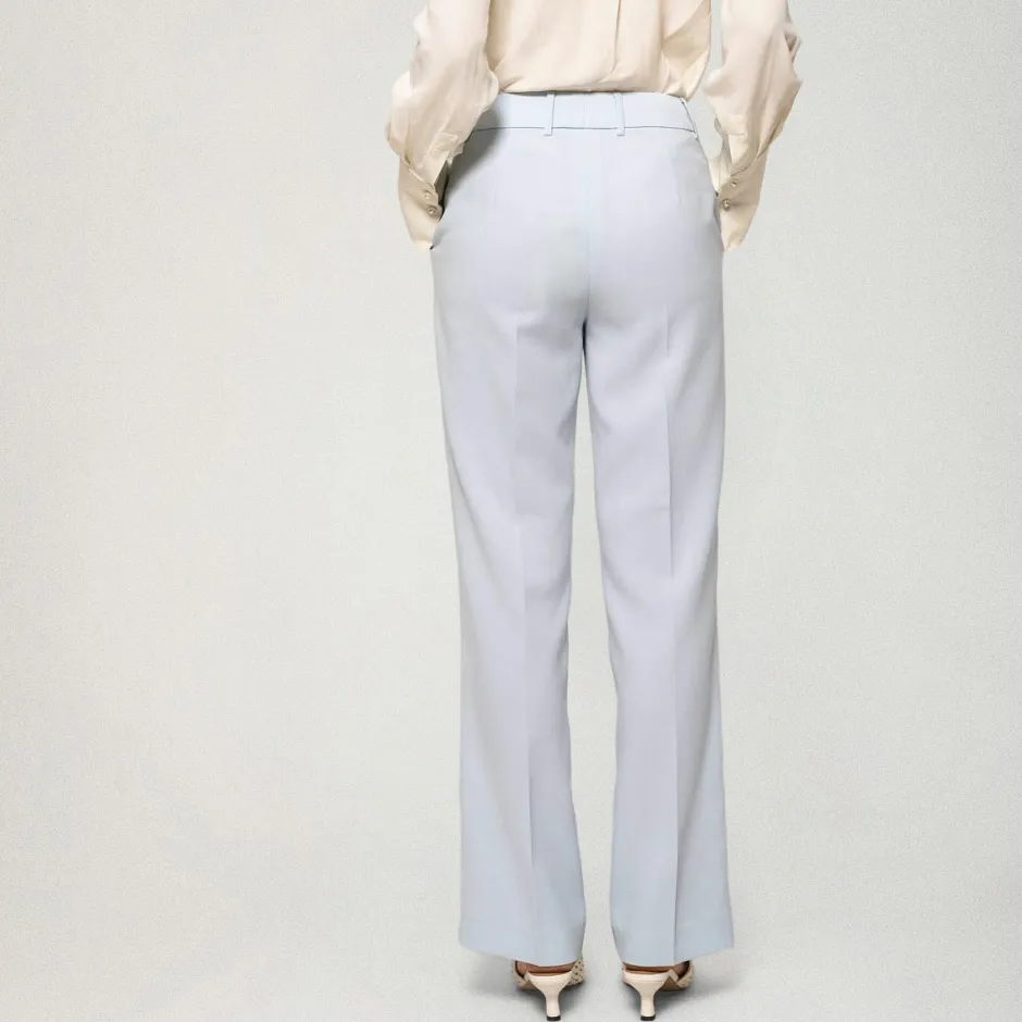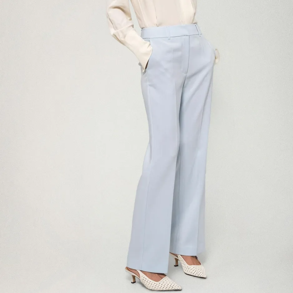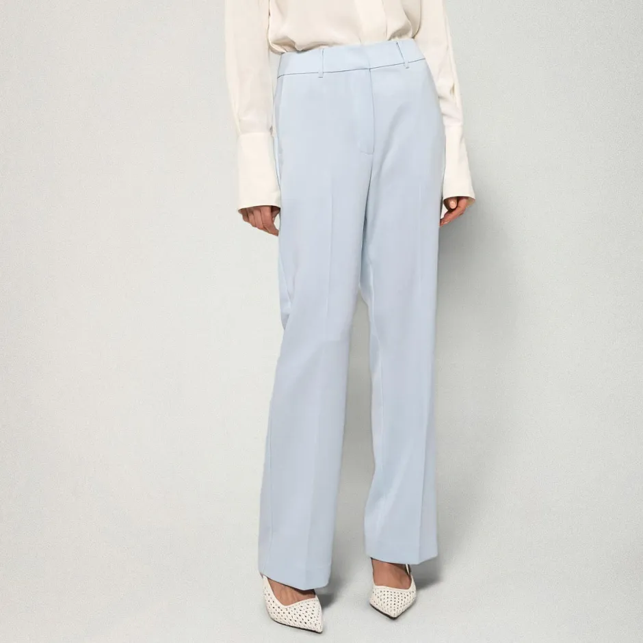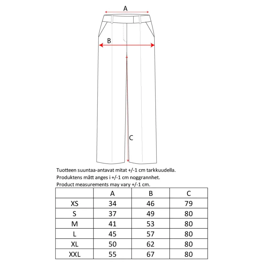 Eleganteissa Nina-housuissa on suorat, prässätyt lahkeet, korkea vyötärö ja sivutaskut. Vetoketju- ja hakaskiinnitys vyötäröllä. Suunniteltu Suomessa.