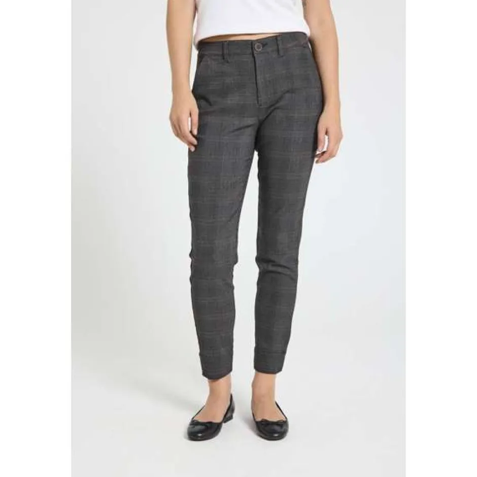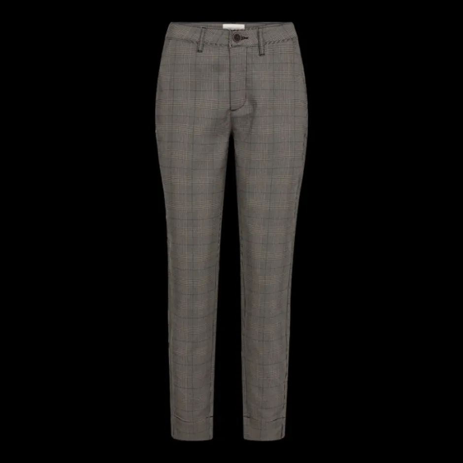 Housuissa on yksinkertainen siluetti, korkea vyötärö, sivutaskut, nappi- ja vetoketjukiinnitys, halkio nilkkapituisissa lahkeissa ja elegantti, kapea istuvuus.